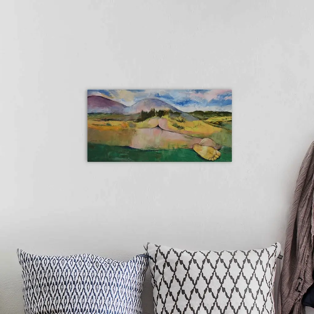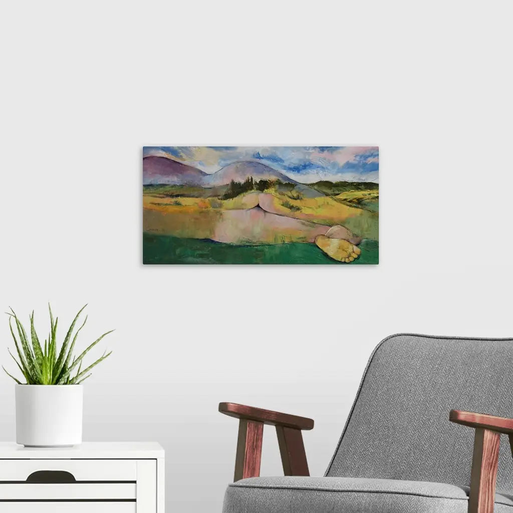 A contemporary painting of a countryside landscape masking a nude female body.