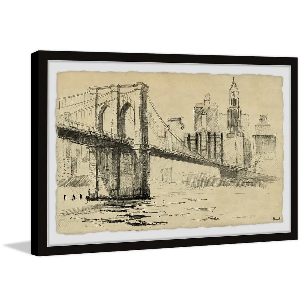 Show off your love for the Big Apple with this drawing print that features a detailed depiction of the Brooklyn Bridge. Proudly printed in the USA, this piece is printed on high quality archive paper and professionally hand-framed. With wall-mounting hooks included, this artful accent is ready to hang up as soon as it reaches your front door. • Top quality Giclee print on high resolution Archive Paper • Hand cut deckled edges • High quality durable non-warping frame • Finished under shatter resistant plexiglass • Arrives ready to hang • Includes a certificate of authenticity • Printed in the USA