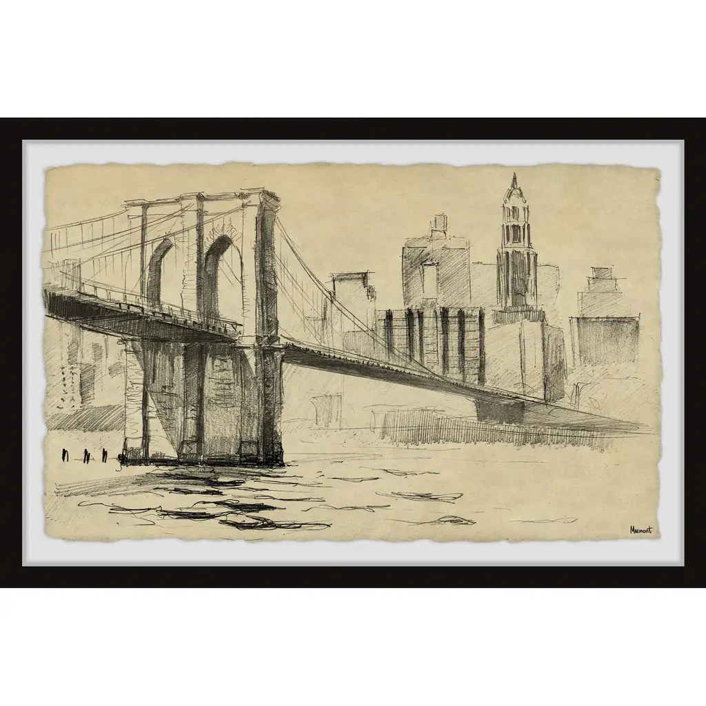Show off your love for the Big Apple with this drawing print that features a detailed depiction of the Brooklyn Bridge. Proudly printed in the USA, this piece is printed on high quality archive paper and professionally hand-framed. With wall-mounting hooks included, this artful accent is ready to hang up as soon as it reaches your front door. • Top quality Giclee print on high resolution Archive Paper • Hand cut deckled edges • High quality durable non-warping frame • Finished under shatter resistant plexiglass • Arrives ready to hang • Includes a certificate of authenticity • Printed in the USA