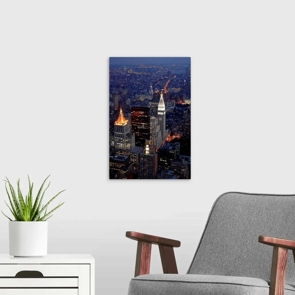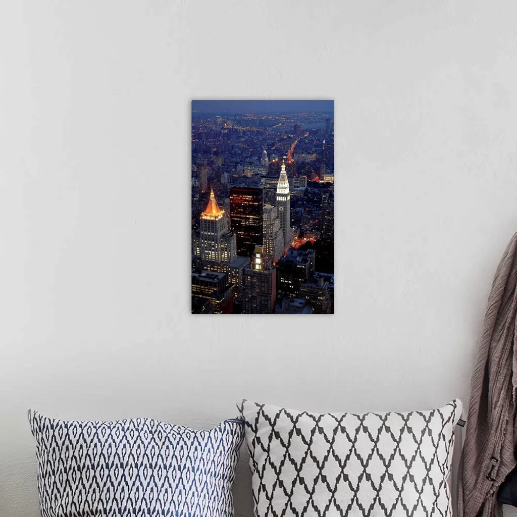 This vertical artwork is an aerial photograph of a Manhattan skyscrapers illuminated in the evening.