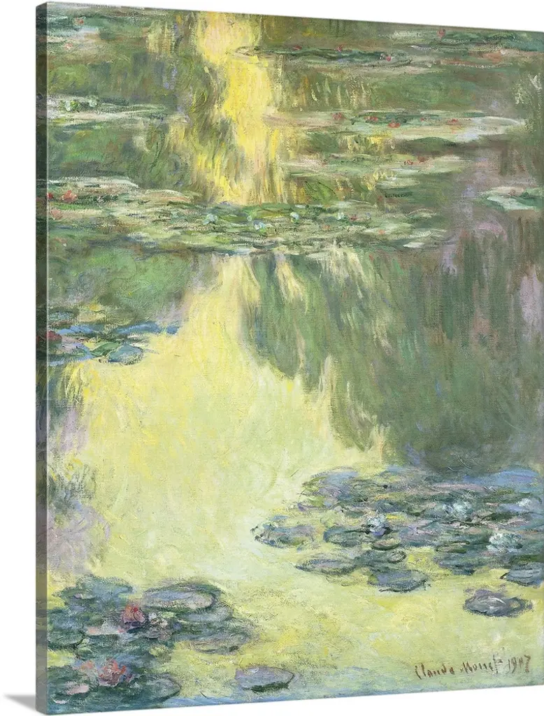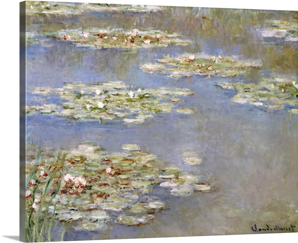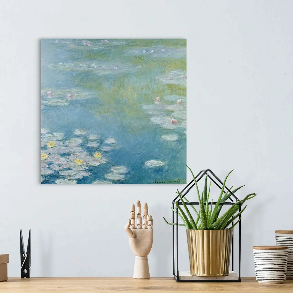 Oversized, square, classic wall painting in the Impressionist style, of a pond with swirling blue water, full of groupings of lily pads and greenery.