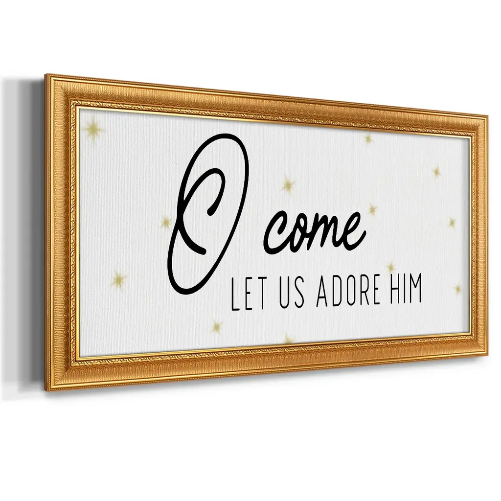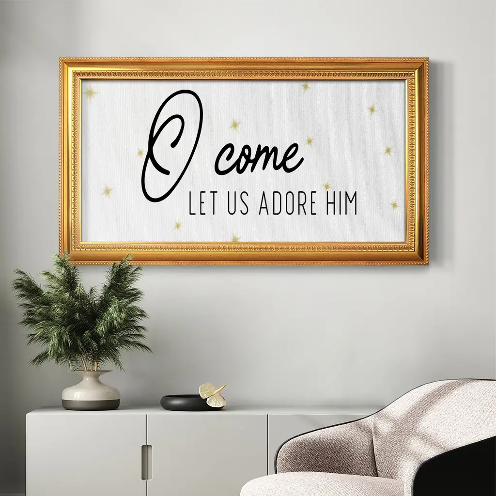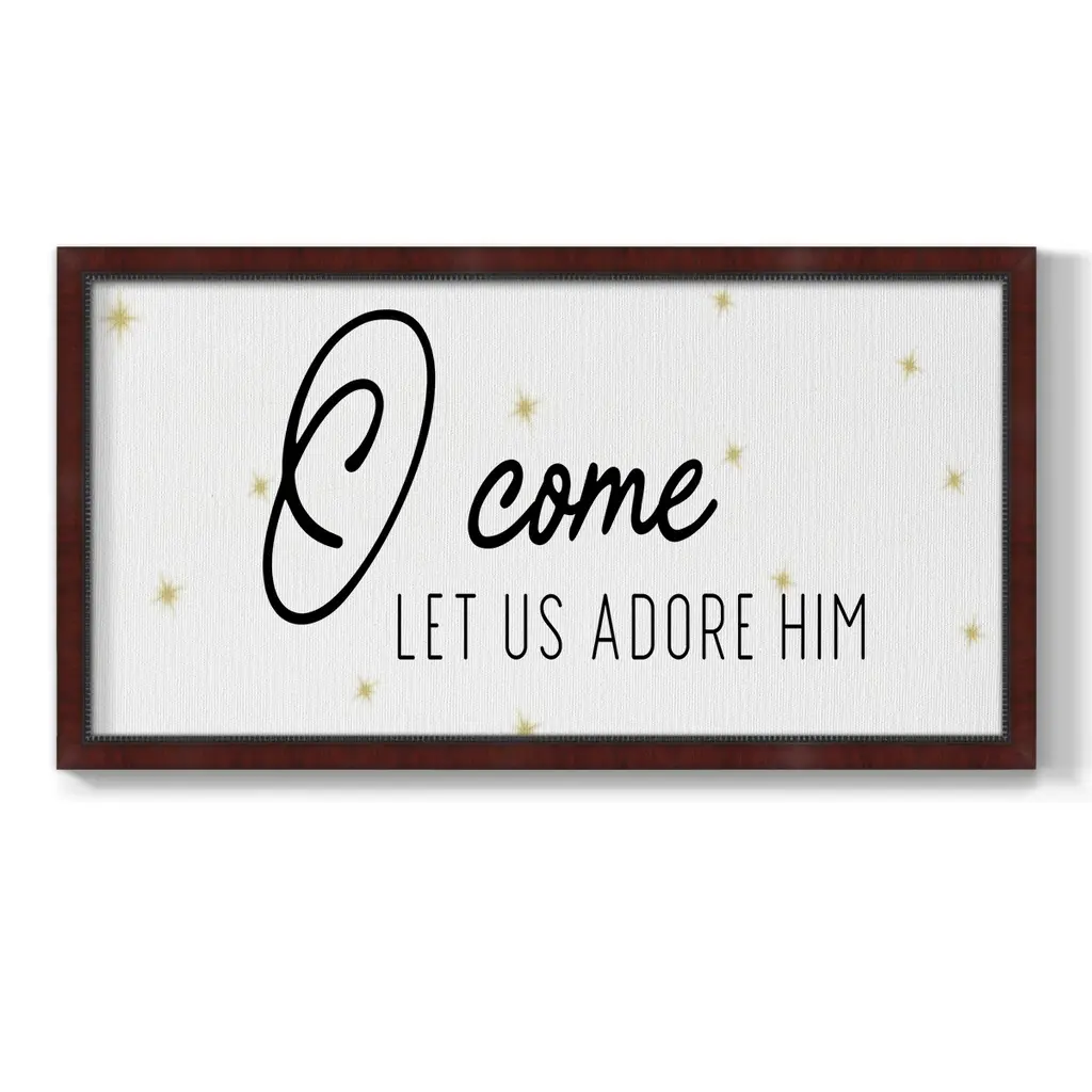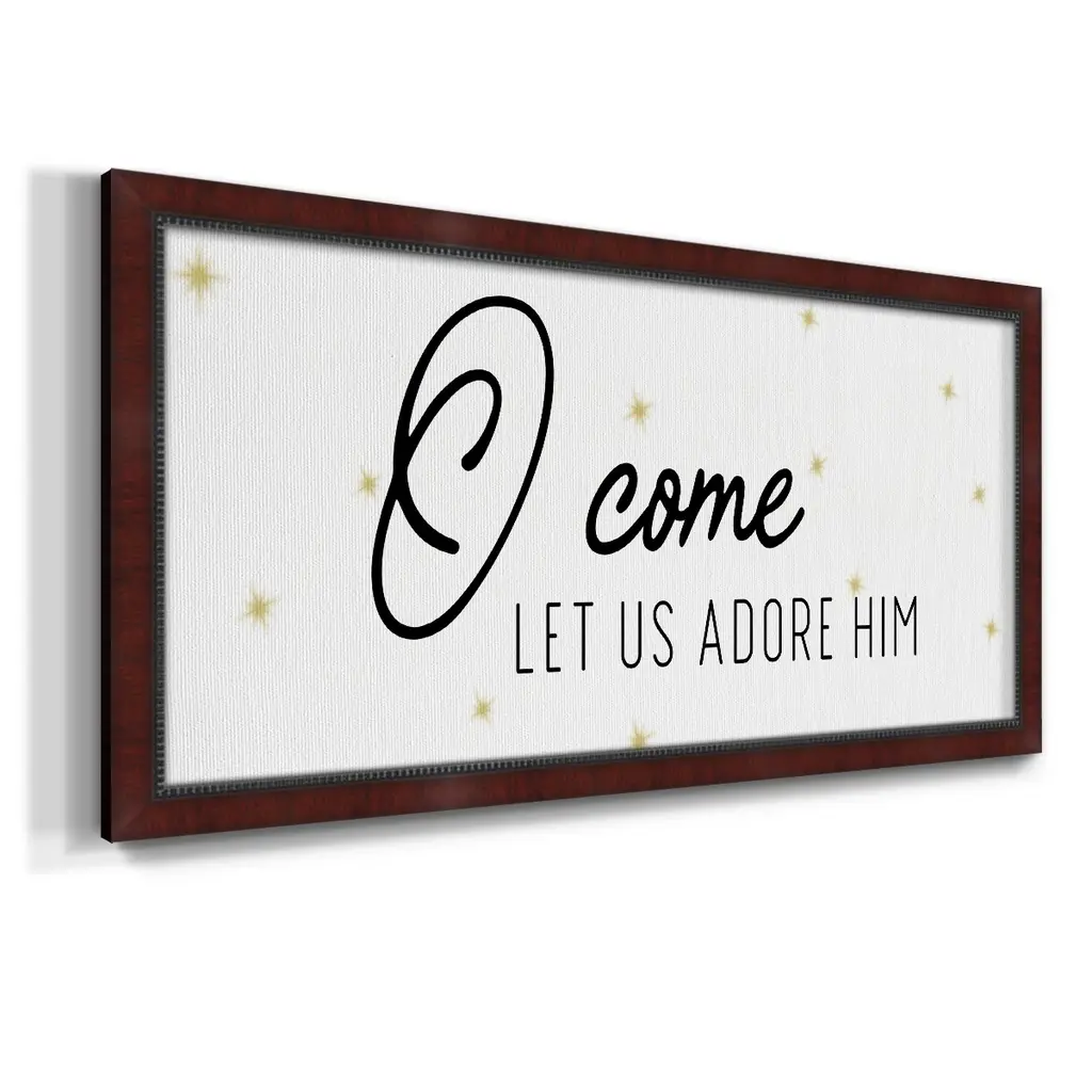 O Come Premium Framed Canvas- Ready to Hang A Premium Framed Canvas created to last. Framed in distressed wood and available in an array of sizes and colors Featuring a beveled a solid wood stretcher bar, each piece comes ready to hand 3 SIZES AVAILABLE 21''X37'' - Overall Size 25''X45'' - Overall Size 29''x53'' - Overall Size Each piece is made to order. Each piece comes with hanging hardware. Made in the USA Ready to Hang Giclee Paper Print Acrylic Glass Beveled Matt Board