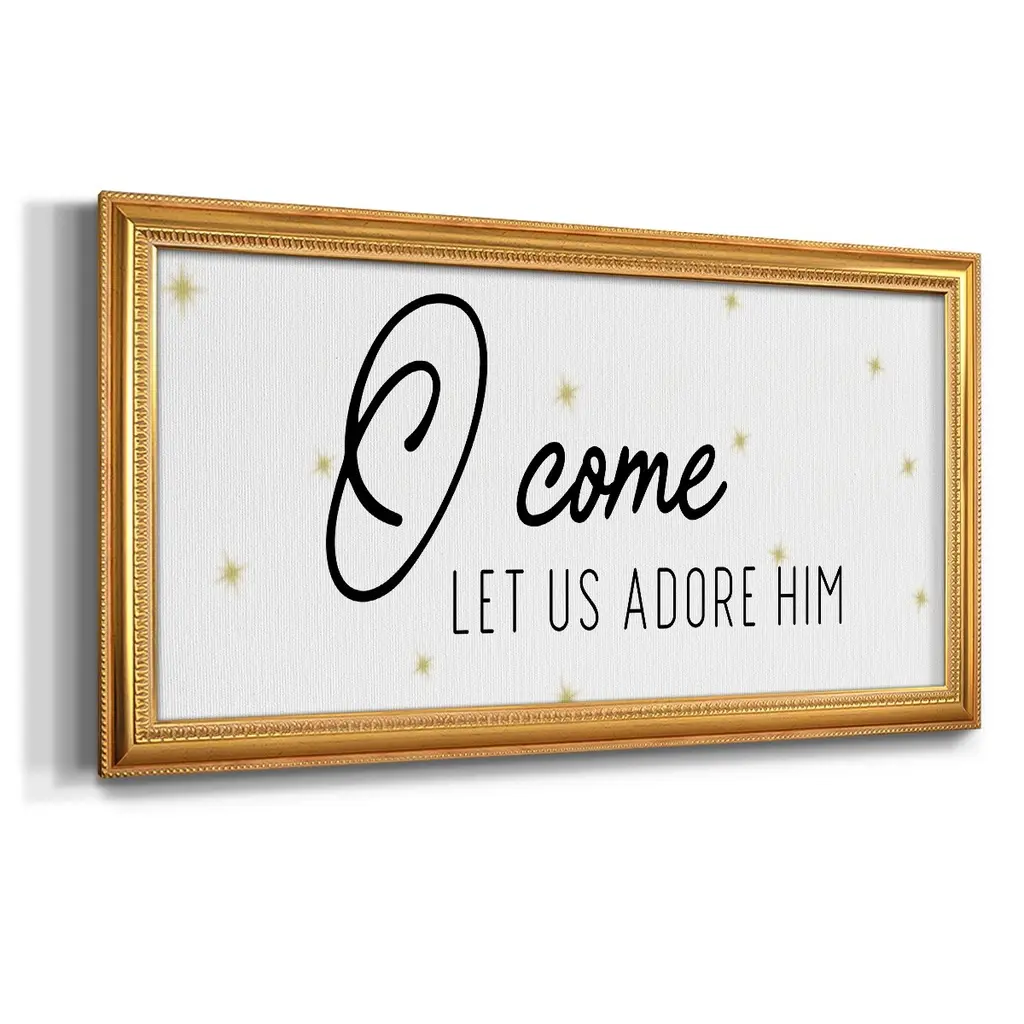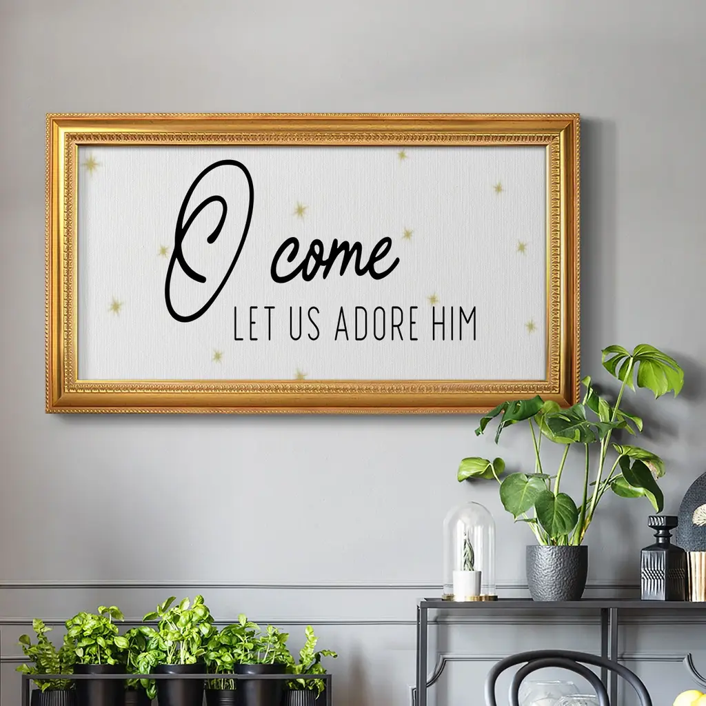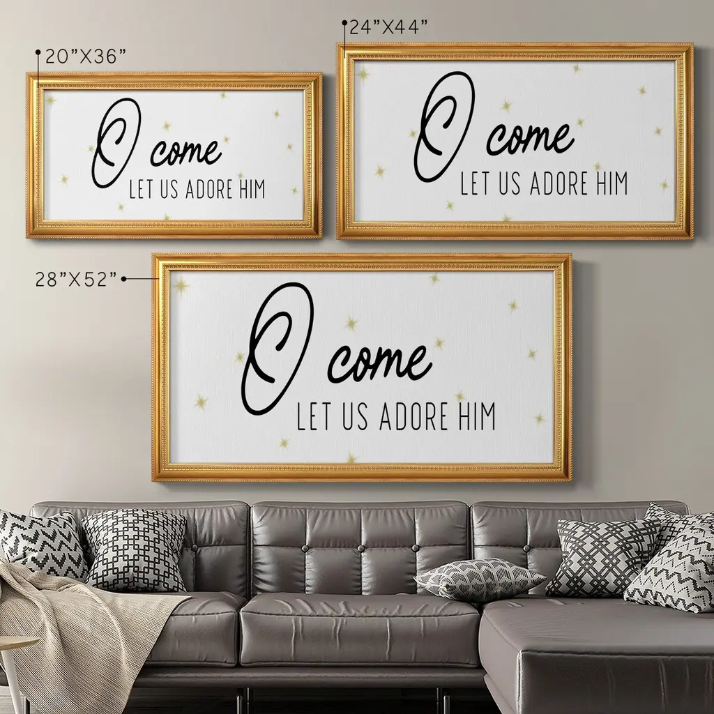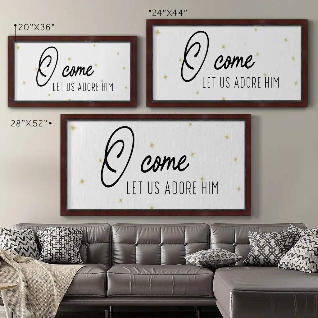 O Come Premium Framed Canvas- Ready to Hang A Premium Framed Canvas created to last. Framed in distressed wood and available in an array of sizes and colors Featuring a beveled a solid wood stretcher bar, each piece comes ready to hand 3 SIZES AVAILABLE 21''X37'' - Overall Size 25''X45'' - Overall Size 29''x53'' - Overall Size Each piece is made to order. Each piece comes with hanging hardware. Made in the USA Ready to Hang Giclee Paper Print Acrylic Glass Beveled Matt Board