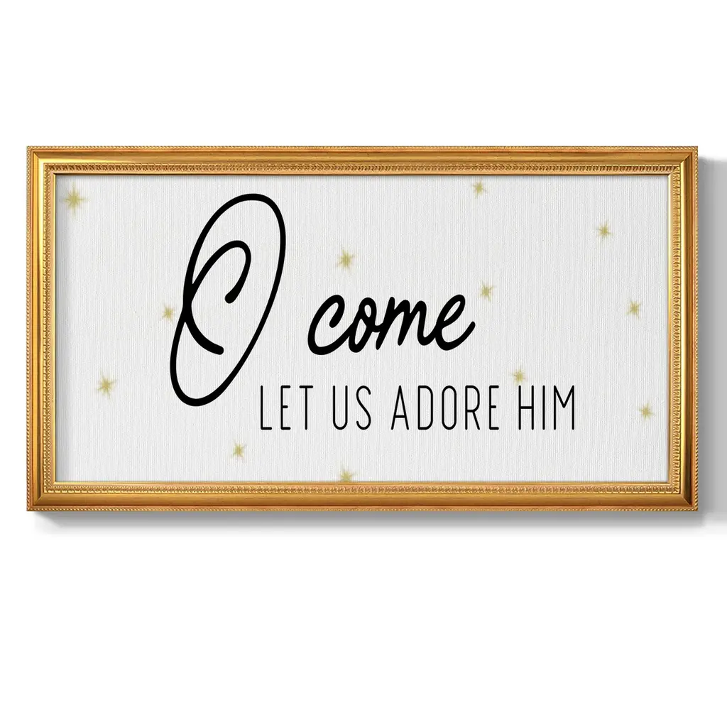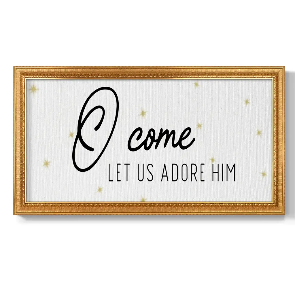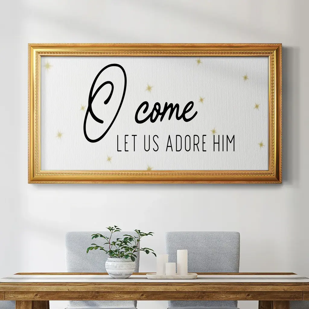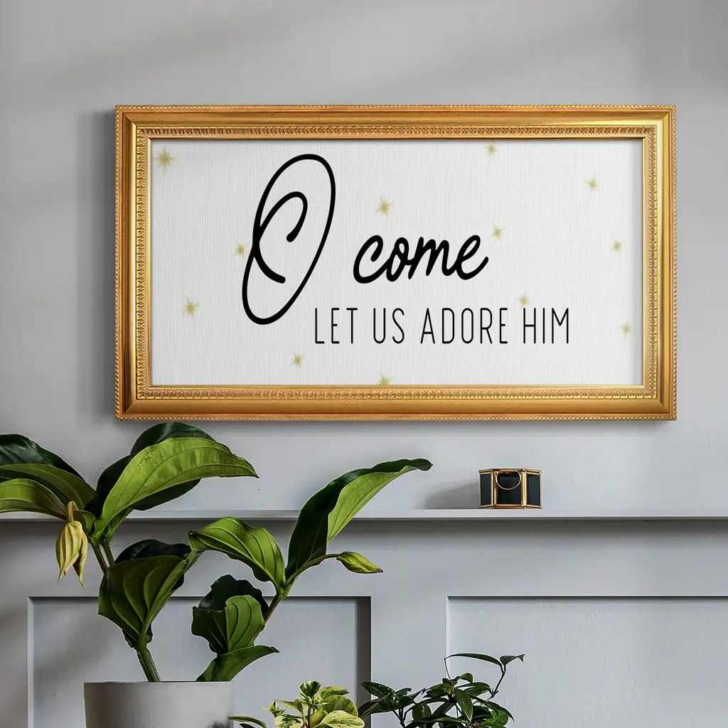 O Come Premium Framed Canvas- Ready to Hang A Premium Framed Canvas created to last. Framed in distressed wood and available in an array of sizes and colors Featuring a beveled a solid wood stretcher bar, each piece comes ready to hand 3 SIZES AVAILABLE 21''X37'' - Overall Size 25''X45'' - Overall Size 29''x53'' - Overall Size Each piece is made to order. Each piece comes with hanging hardware. Made in the USA Ready to Hang Giclee Paper Print Acrylic Glass Beveled Matt Board