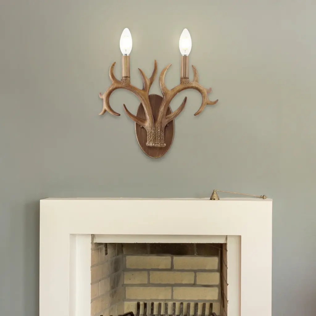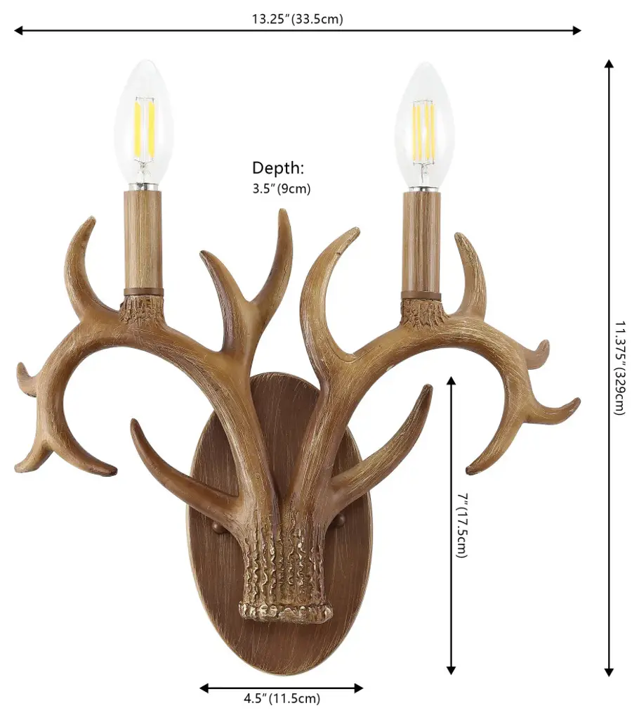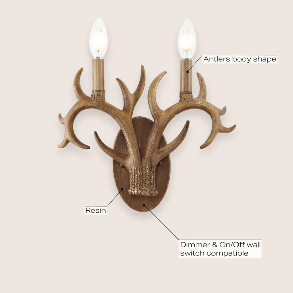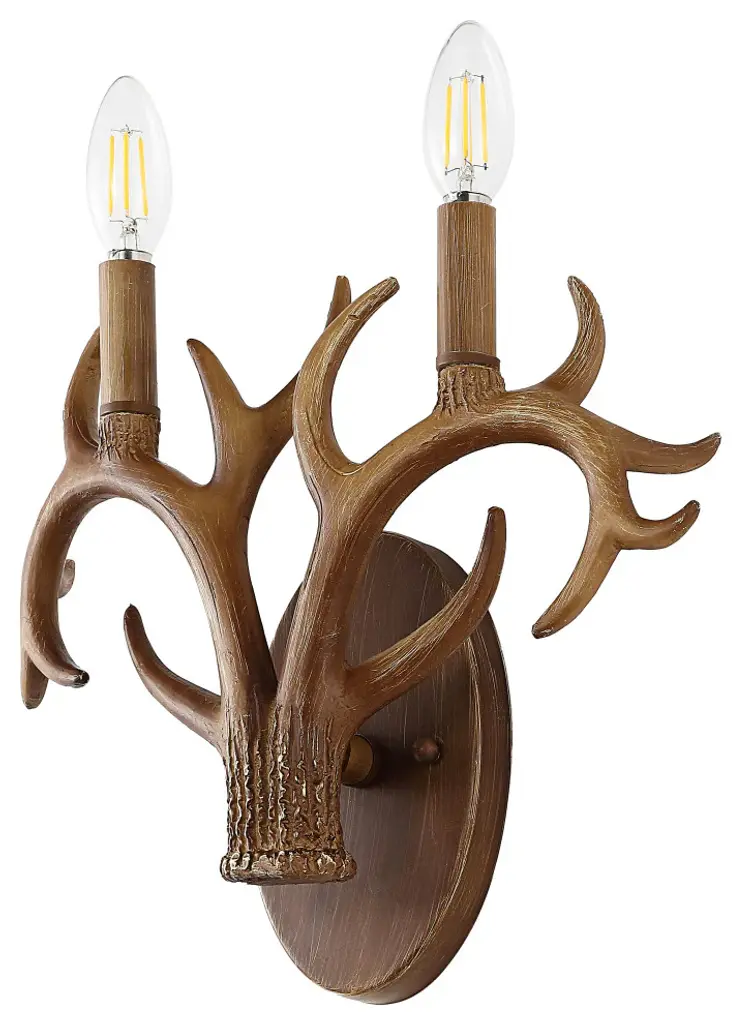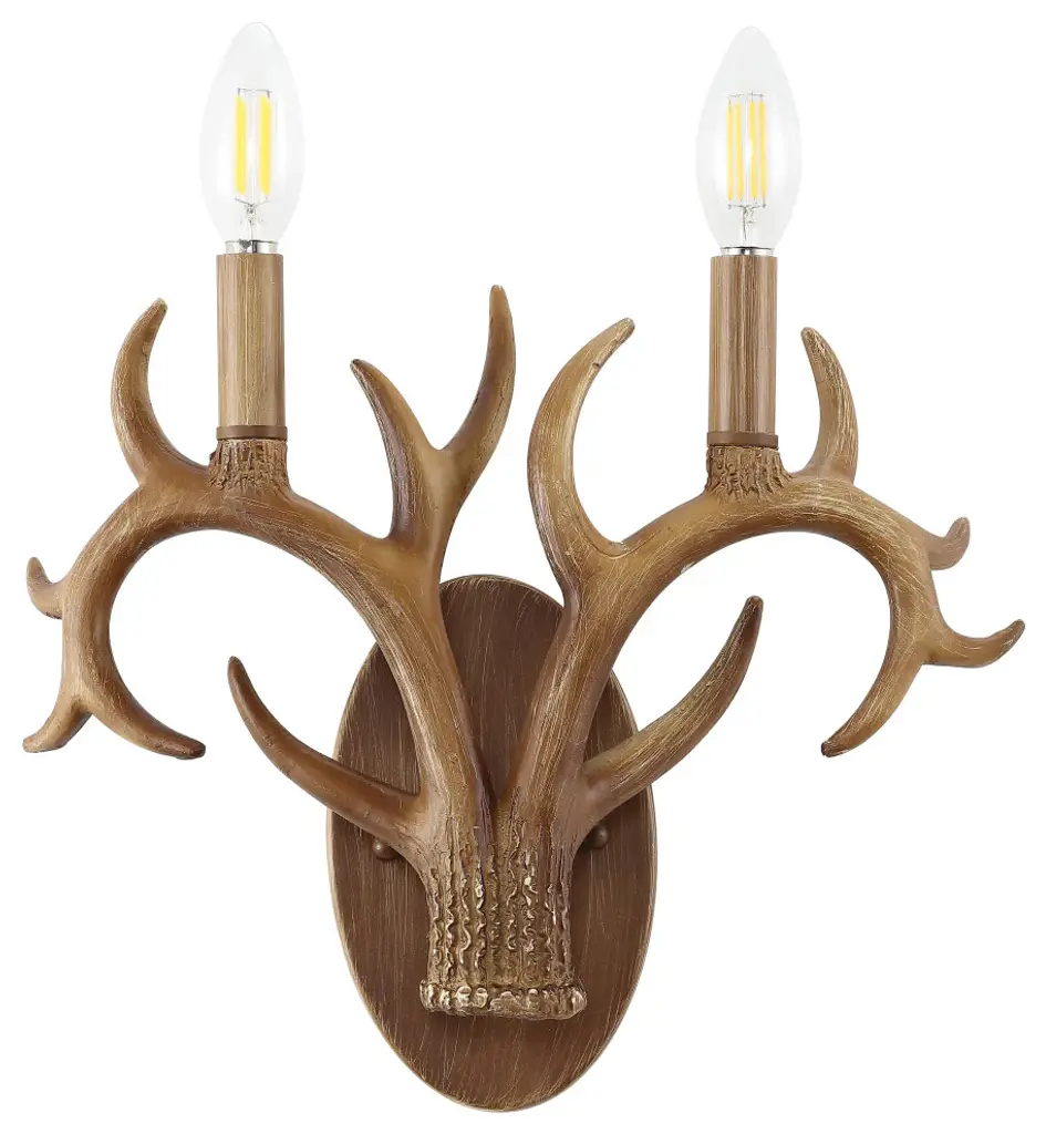 This classic antler wall sconce adds rustic style to your entry, dining room or bathroom vanity. Two-light design features curving faux antlers and vintage style candle sleeves topped with bright LED bulbs. Buy a pair to flank a mirror or painting, or illuminate a long hallway.-Resin antlers and backplate have a natural-looking textured brown finish-Candle-style LED bulbs creates warm, bright light; our wall lights work with LED-compatible dimmers-Update your wall sconces or vanity lights with this Scandinavian classic for an instant rustic style makeover-Eco-friendly 4W LED bulb included-Takes 2 bulbs and compatible with TYPE "B" 40W or CFL 13W or LED 9W-Color Temperature: 2700K-CRI: 80-Color: Brown Wood Finish-Body Material: Resin-Base Material: Metal----Includes: One (1) lamp-Assembly Required-Lamp: 11.38 inches high x 13.25 inches wide x 3.5 inches deep-You see a lamp.We see a decorative work of art.A perfectly curved shade casts a dramatic shadow on a floor. Compatible with LED lightbulbs: as easy on the environment as they are on the eyes. The JONATHAN Y Lighting collection considers every detail from impeccably sourced materials to designer styling. And our prices are so attractive, weeve transformed a functional necessity into a fashion accessory.JONATHAN Y Lighting - a fashion revolution in home decor.