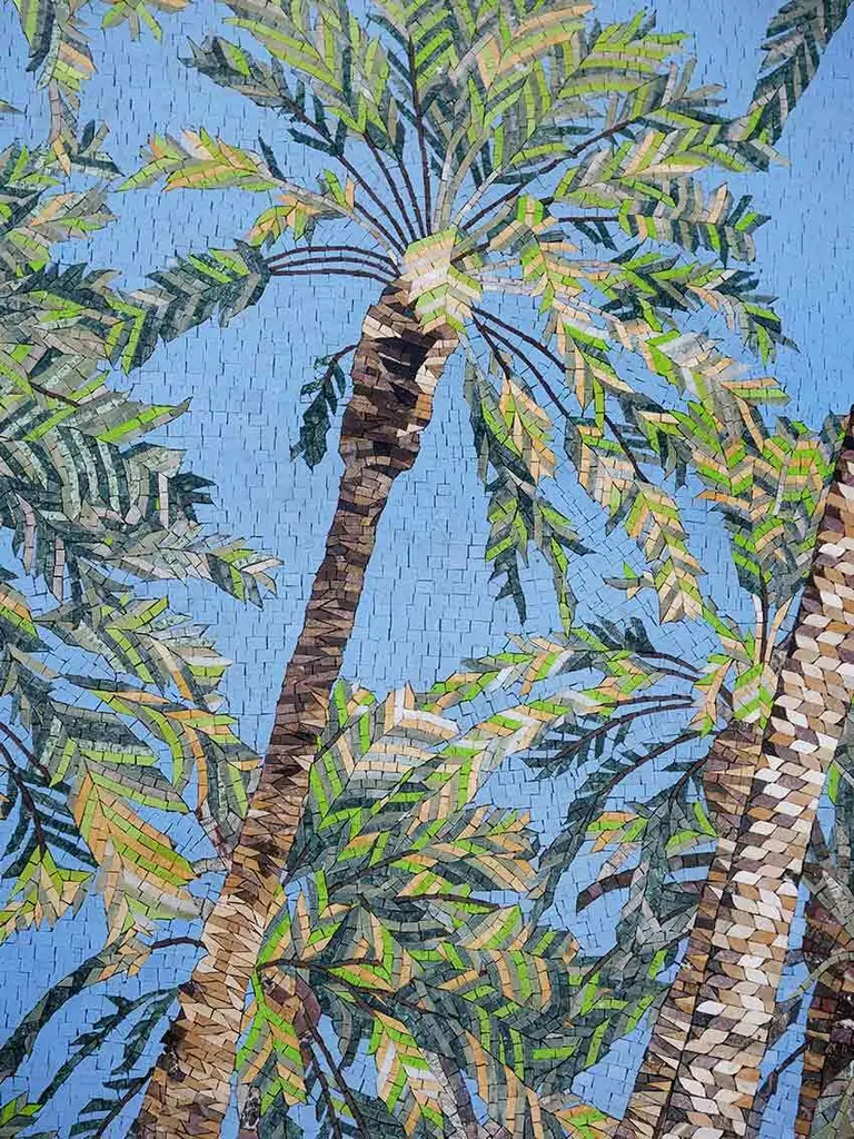 Escape to a tranquil oasis with this captivating mosaic artwork. Towering palm trees sway gently against a clear blue sky, their lush fronds rendered in exquisite detail. The artist's skillful use of tesserae captures the textures and hues of the desert landscape, creating a sense of serenity and escape. This mosaic is an invitation to unwind, to imagine yourself strolling through a peaceful palm grove, where the only sounds are the rustling leaves and the gentle breeze. Bring the tranquility of nature into your home with this stunning piece of art.
