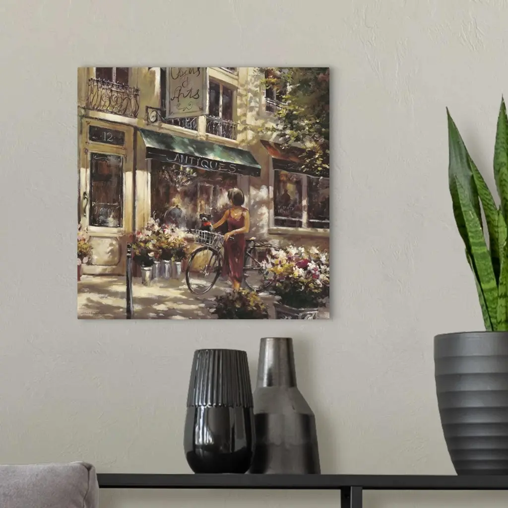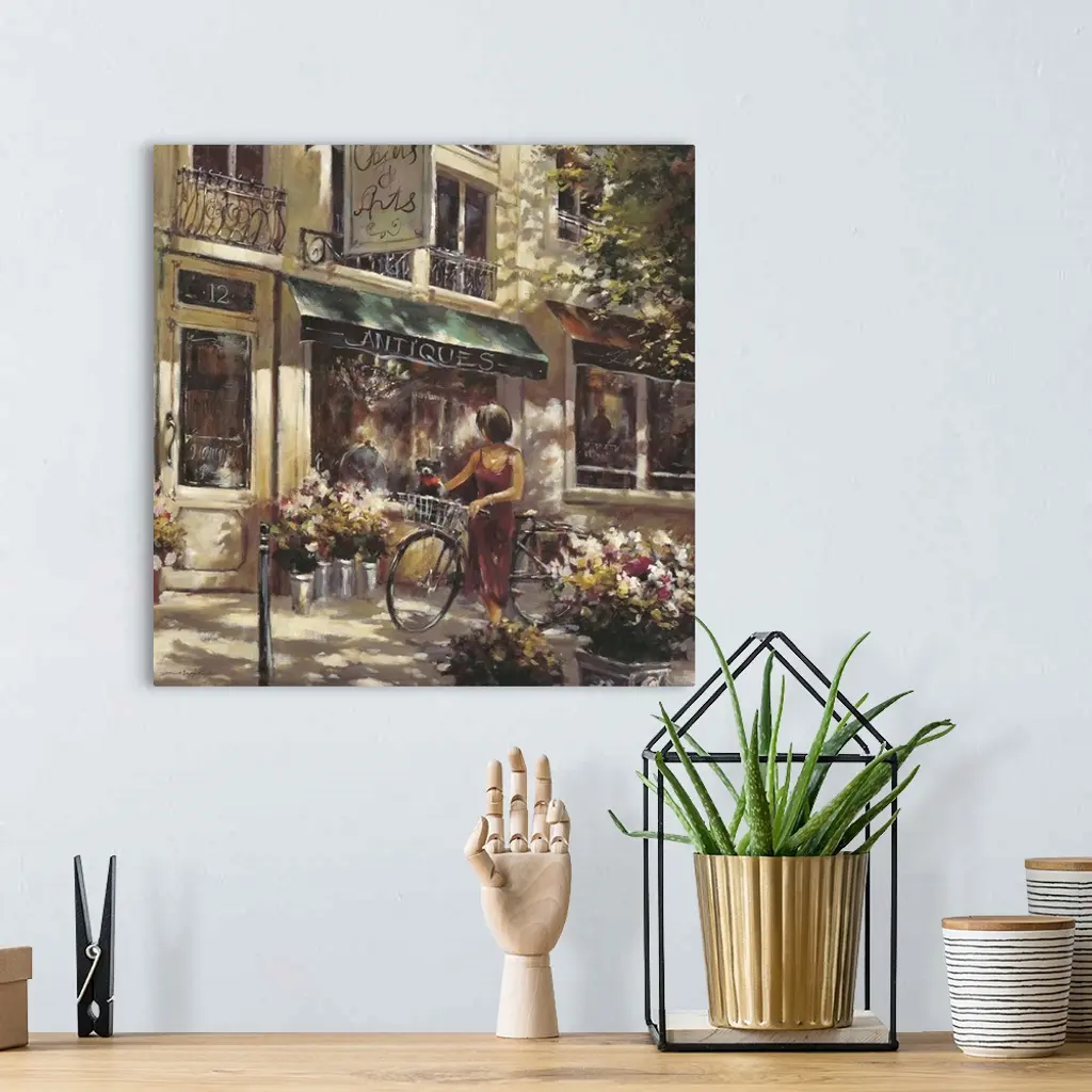 Contemporary painting of a woman walking a bicycle, outside of a flower shop.