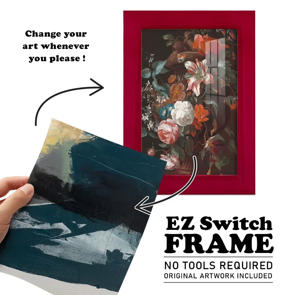 Obscure Abstract III -EZ SWITCH Framed Print w/glass-Cherry Red A delightful, framed print. Featuring a solid wood frame with real wood glass. This premium print is giclee quality. In addition, every frame features a removable back and table top stand. This allows you to change your art in the future or to just stand the art on a table for a new look. We are sure you'll enjoy our new series of EZ SWITCH Framed Art. Solid Wood Frame Real Glass Removable / Replaceable Art Built in Tabletop Stand Sizes range from 4x6 up to 12x15 - buy just one or pair them up as sets as you see fit.