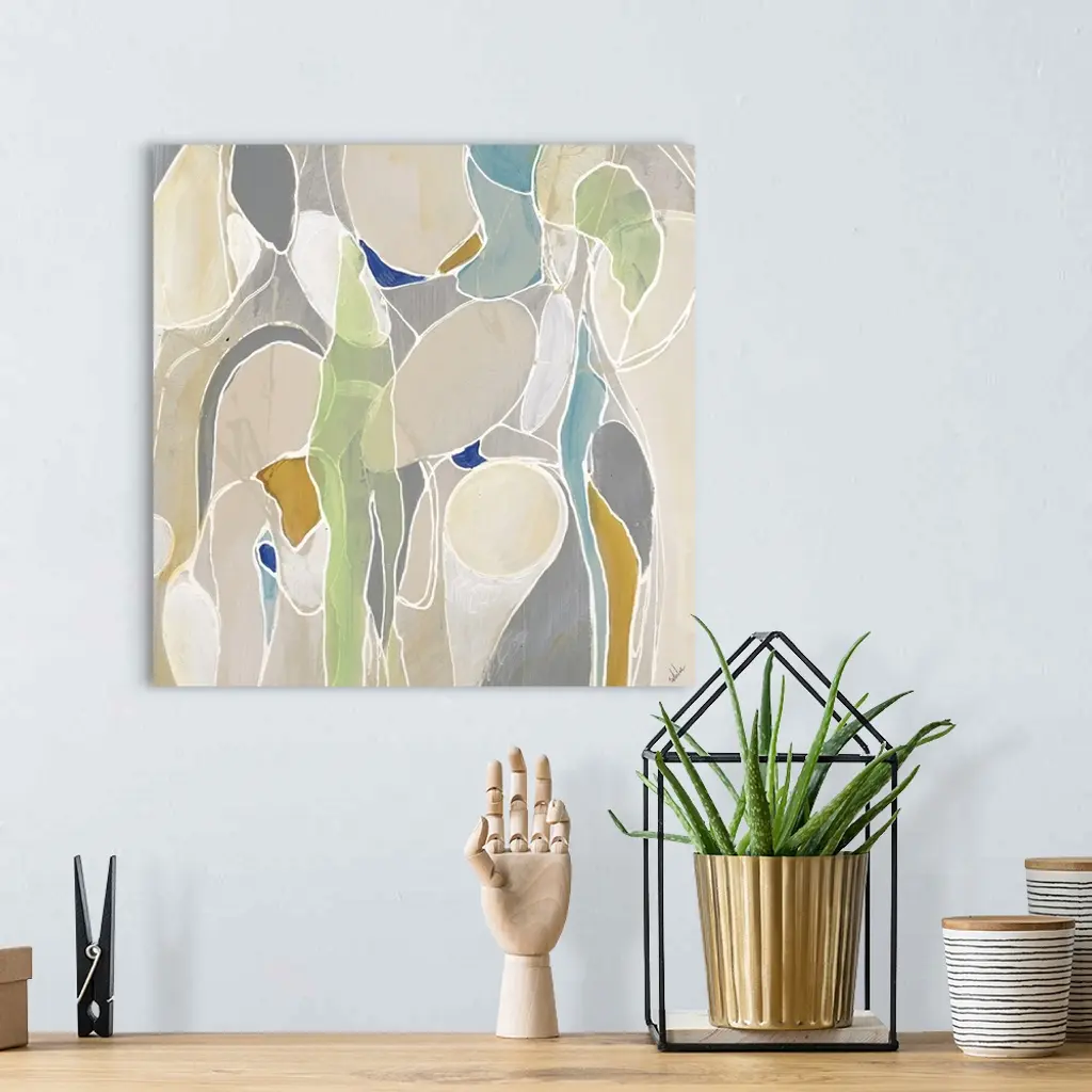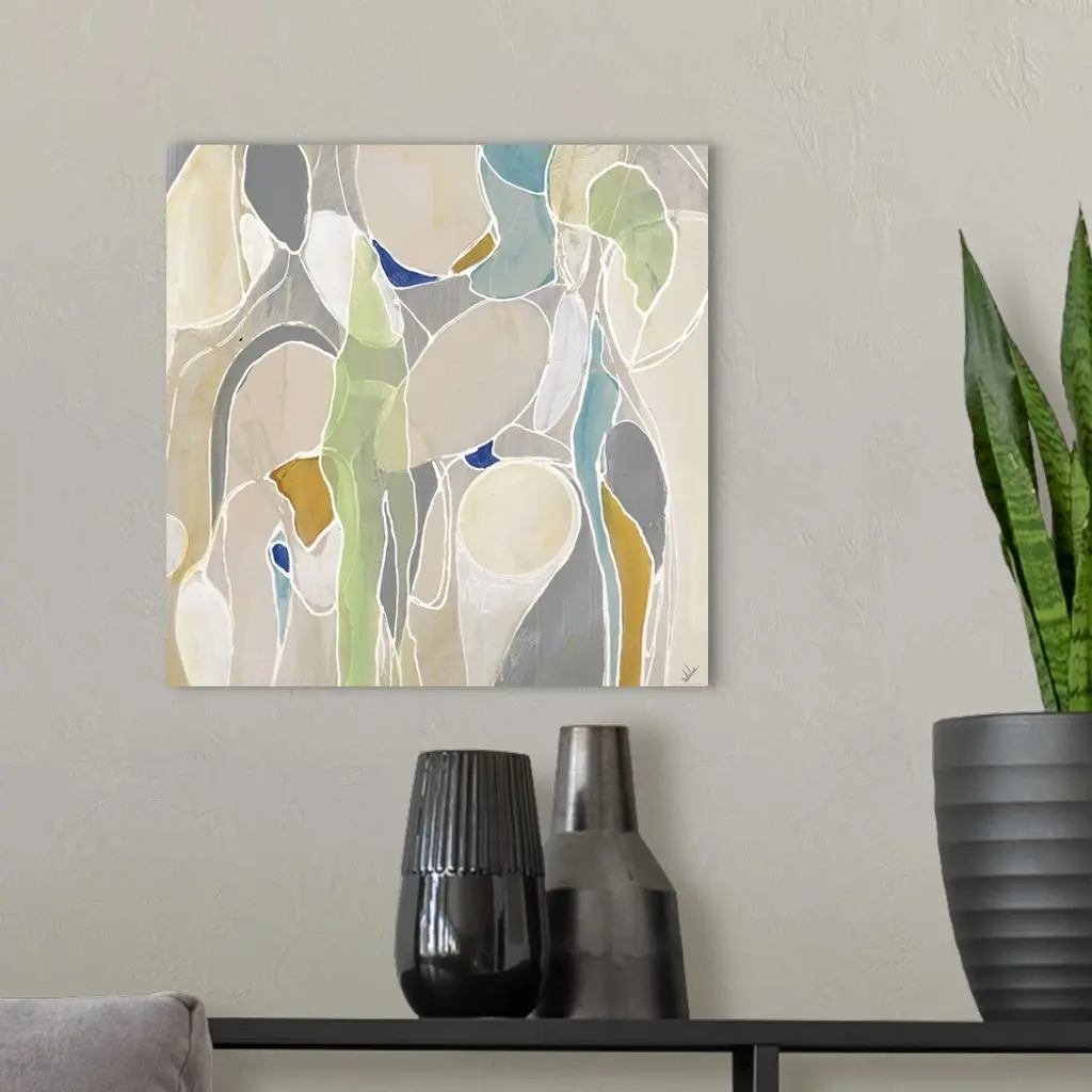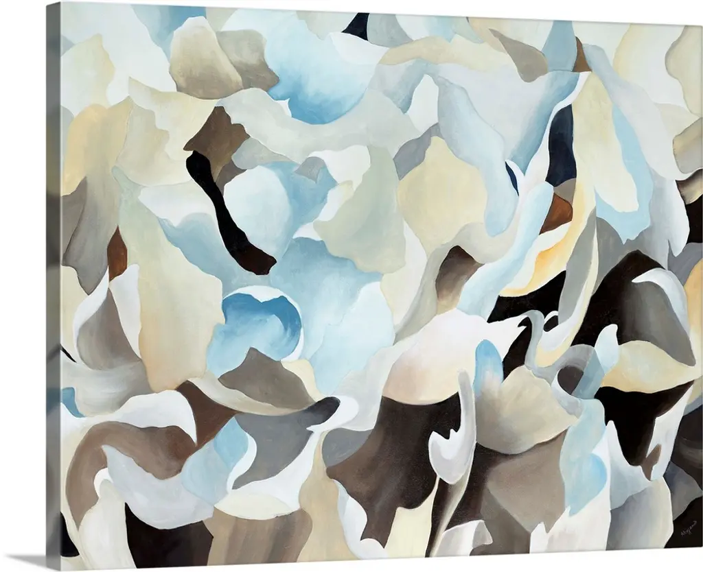 Abstract painting of rounded shapes and sections of various soft tones divided by thin white lines that twist and curve in many directions.