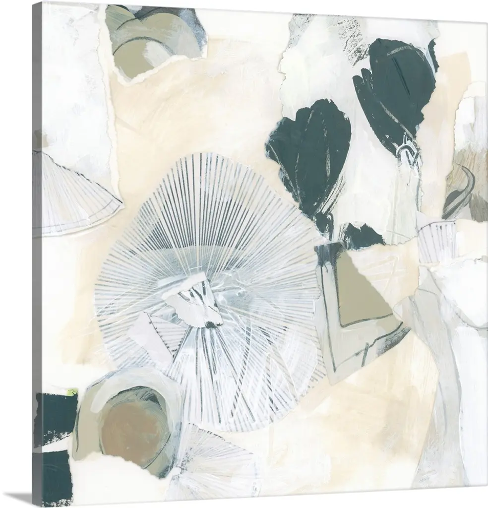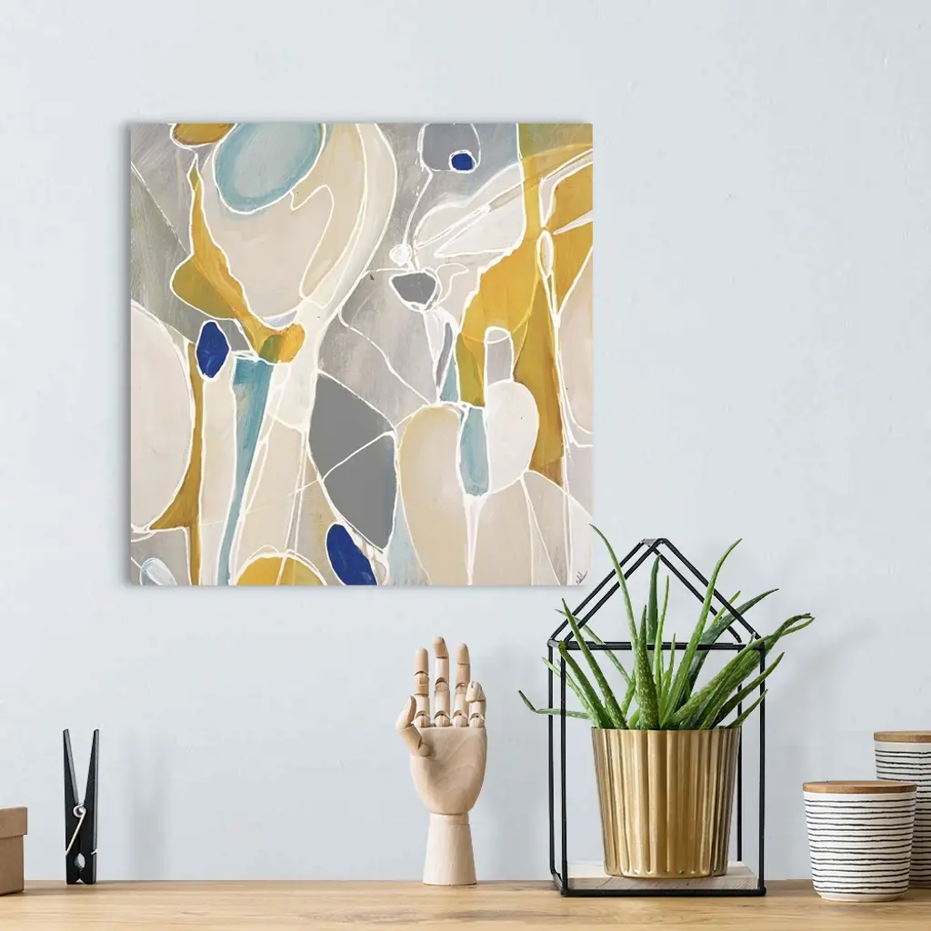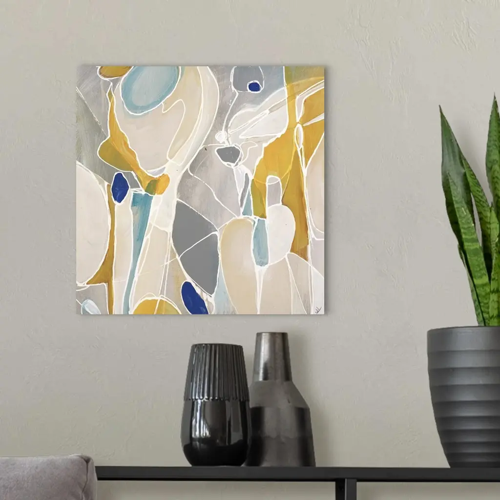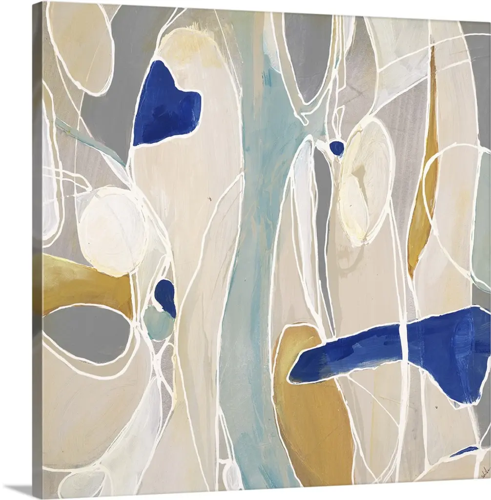 Abstract painting of rounded shapes and sections of various soft tones divided by thin white lines that twist and curve in many directions.