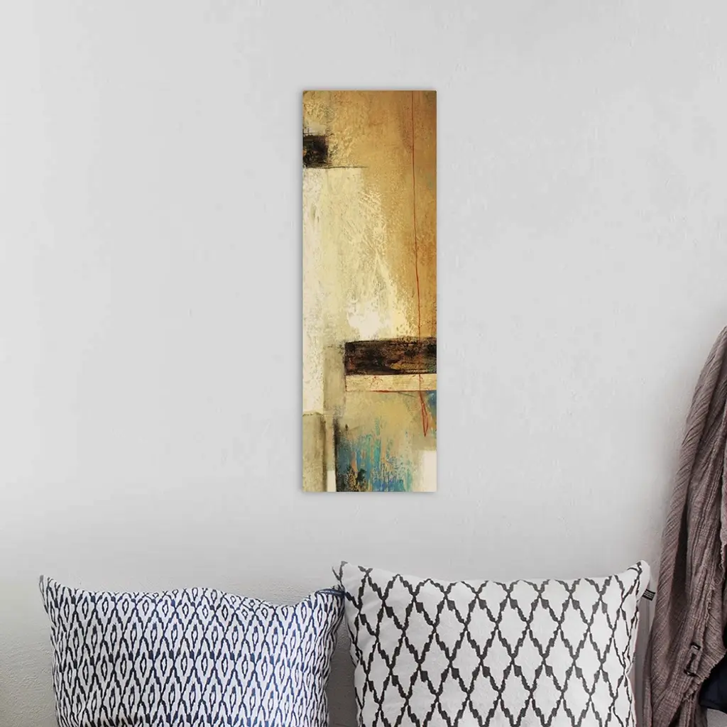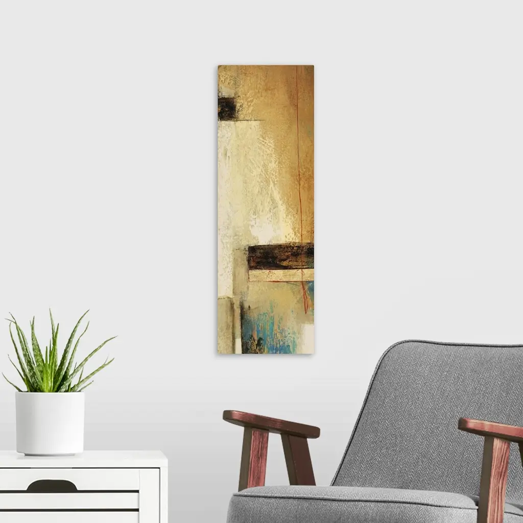 Contemporary abstract artwork using rich earthy tones and textures, mixed with hints of aqua blue.
