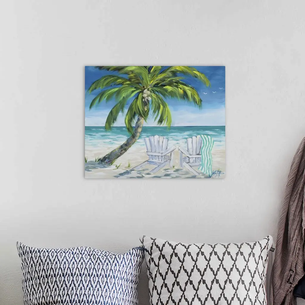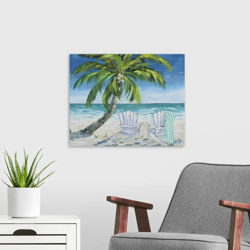 Contemporary painting of a relaxing beach scene with two beach chairs under the shade of a palm tree.