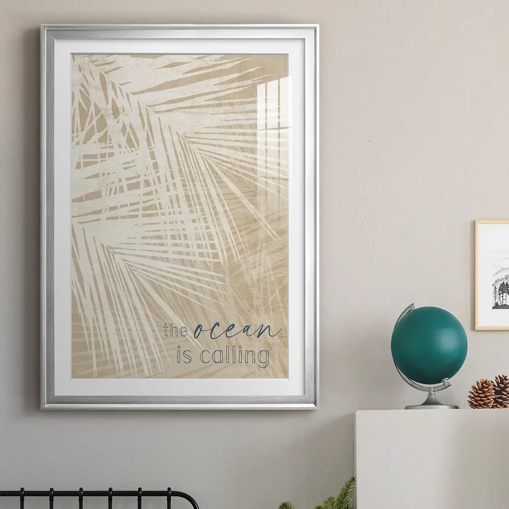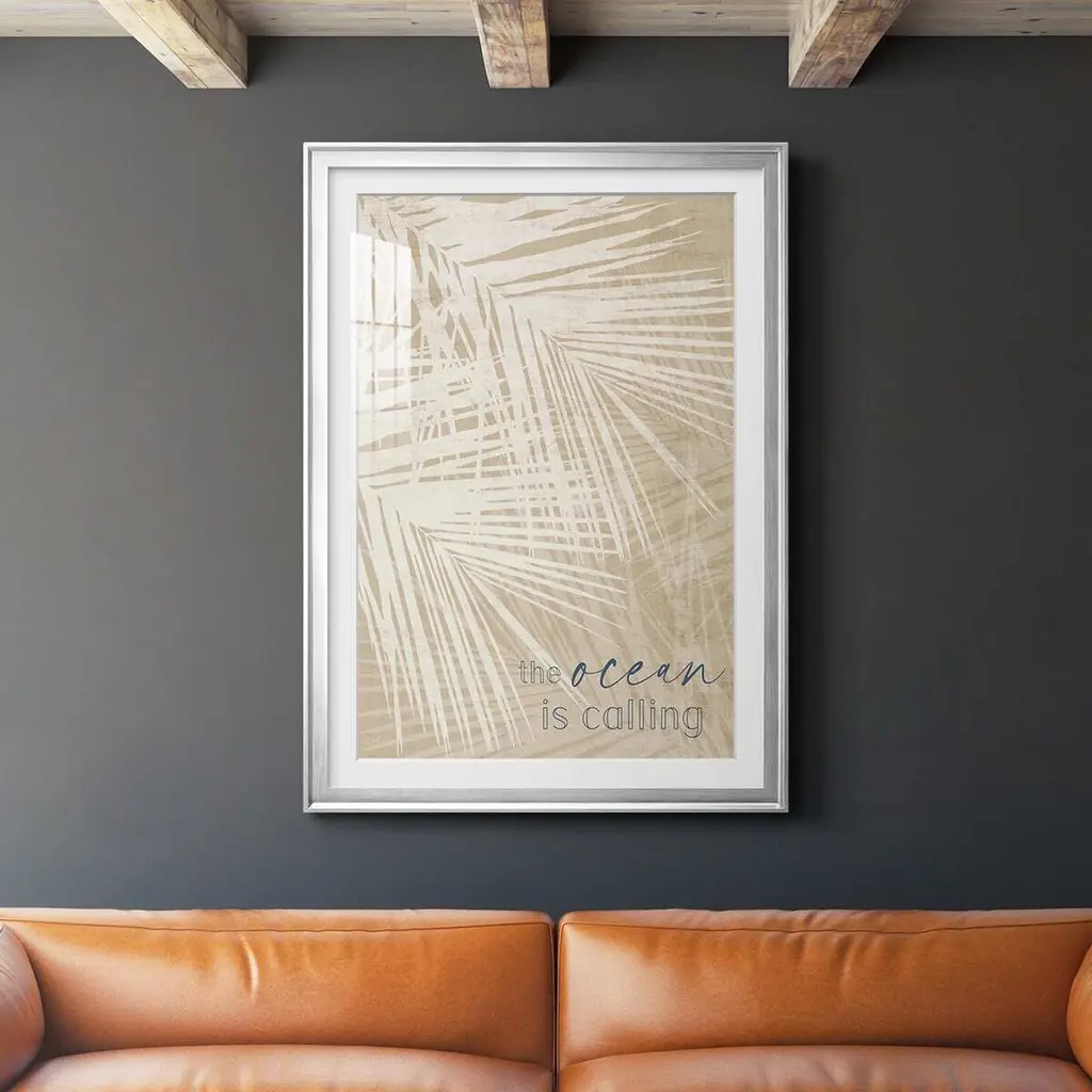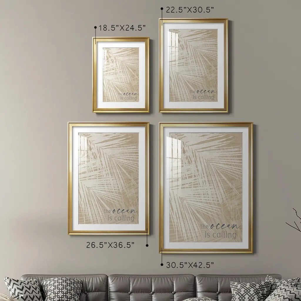 Ocean Calling Palms Premium Framed Print - Ready to Hang A Premium Framed Print created to last. Framed in distressed wood and available in an array of sizes and colors Featuring a beveled a solid wood stretcher bar, each piece comes ready to hand 4 SIZES AVAILABLE 30.5''X42.5'' - Overall Size 26.5'X36.5'' - Overall Size 22.5''x30.5'' - Overall Size 18.5''x24.5'' - Overall Size Each piece is made to order. Each piece comes with hanging hardware. Made in the USA Ready to Hang Giclee Paper Print Acrylic Glass Beveled Matt Board