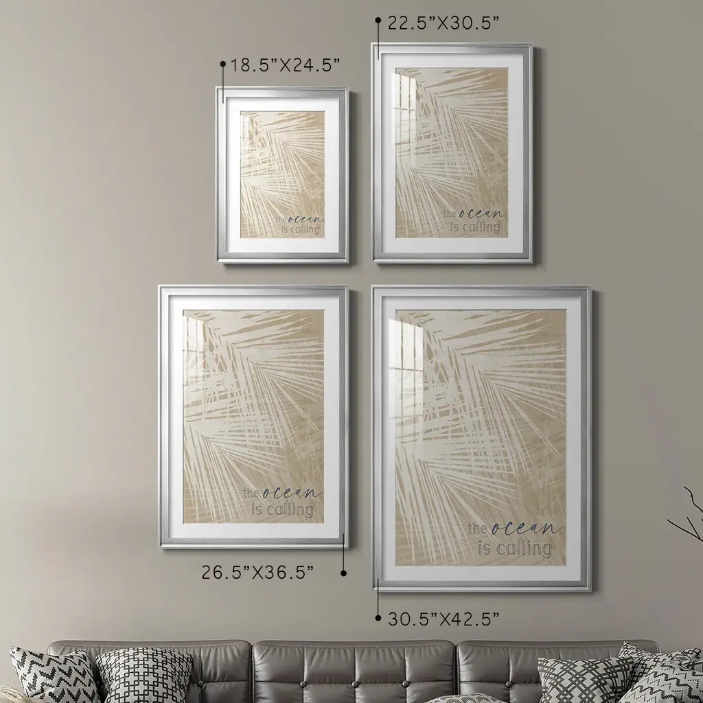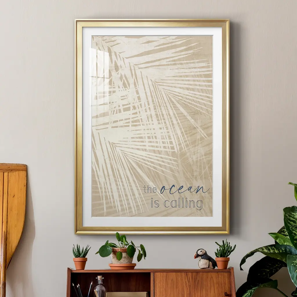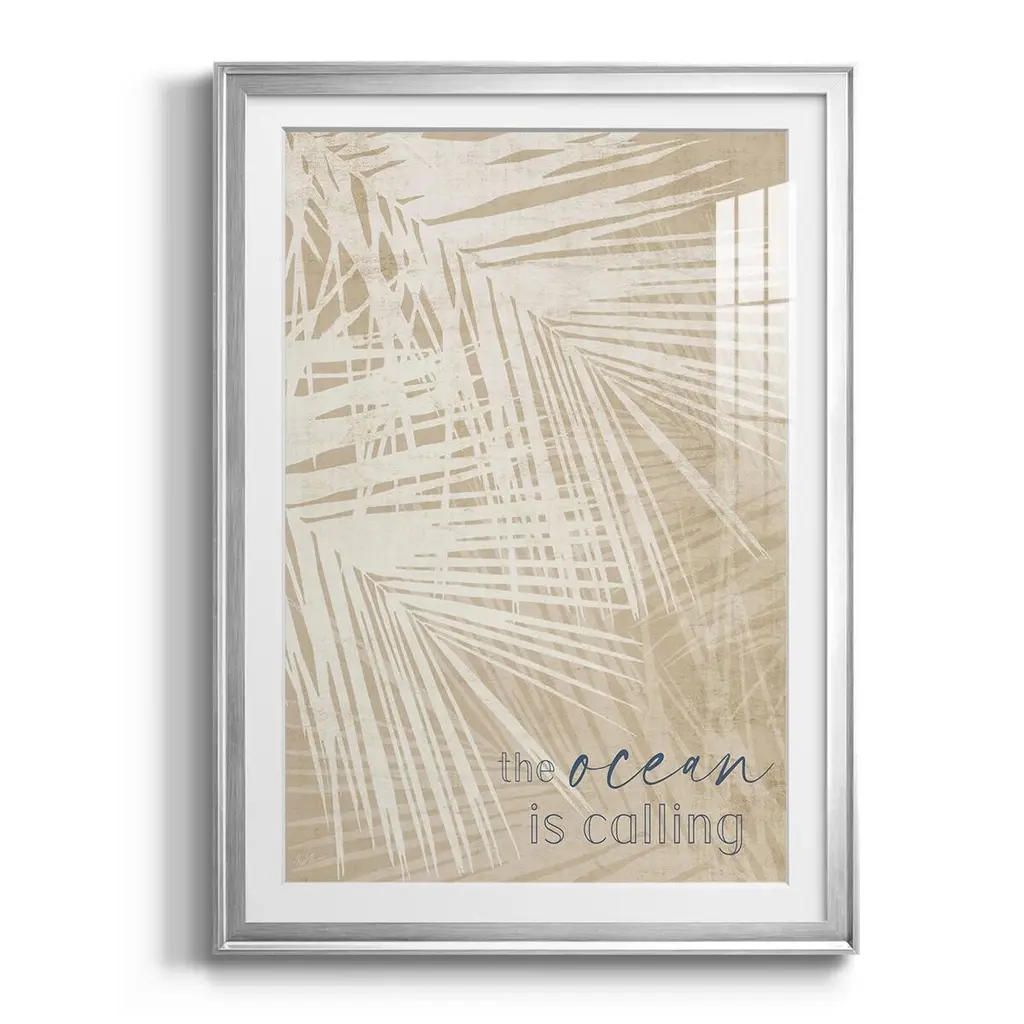 Ocean Calling Palms Premium Framed Print - Ready to Hang A Premium Framed Print created to last. Framed in distressed wood and available in an array of sizes and colors Featuring a beveled a solid wood stretcher bar, each piece comes ready to hand 4 SIZES AVAILABLE 30.5''X42.5'' - Overall Size 26.5'X36.5'' - Overall Size 22.5''x30.5'' - Overall Size 18.5''x24.5'' - Overall Size Each piece is made to order. Each piece comes with hanging hardware. Made in the USA Ready to Hang Giclee Paper Print Acrylic Glass Beveled Matt Board