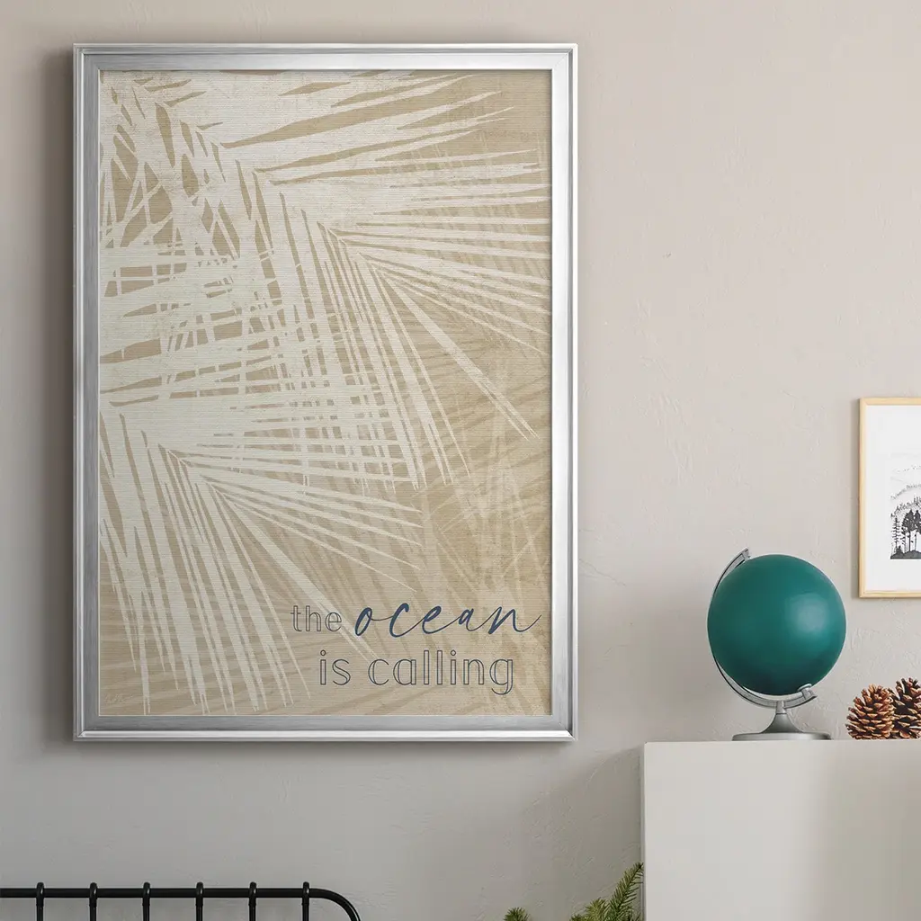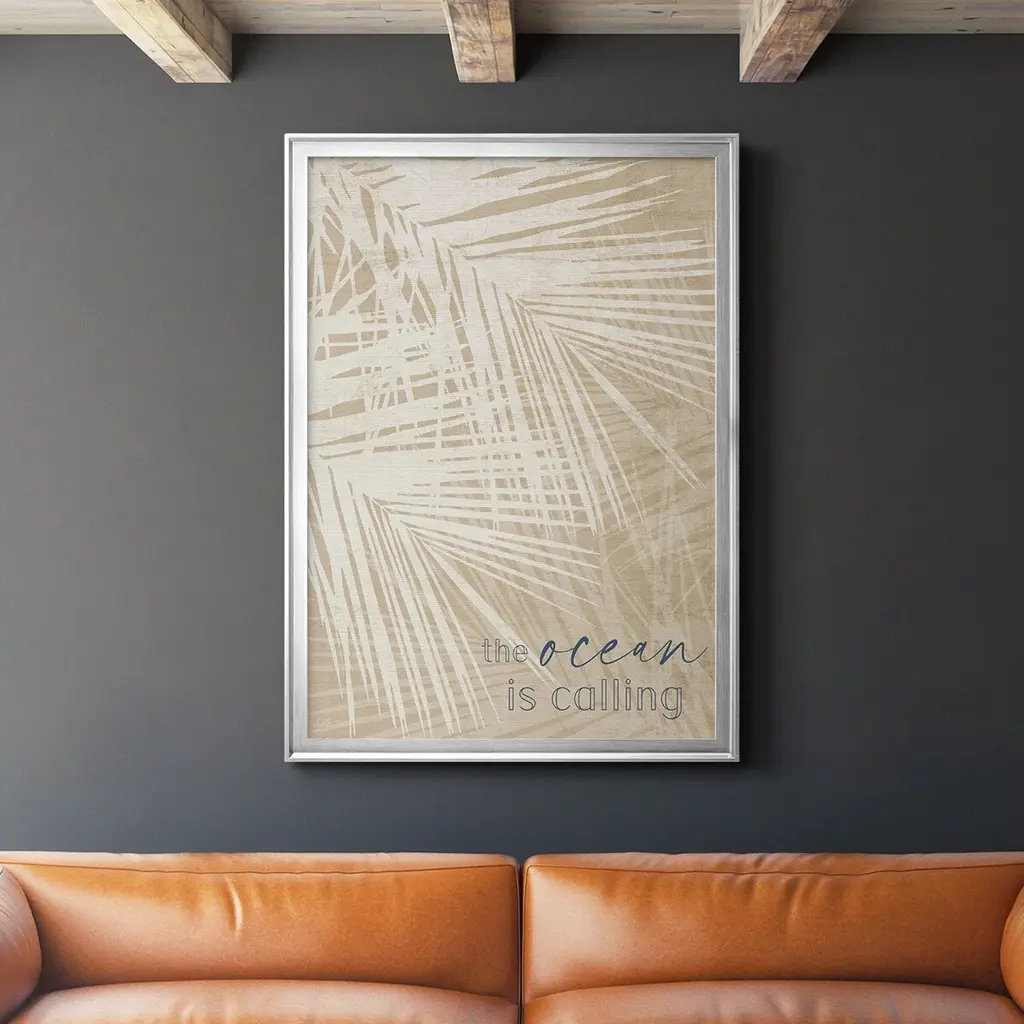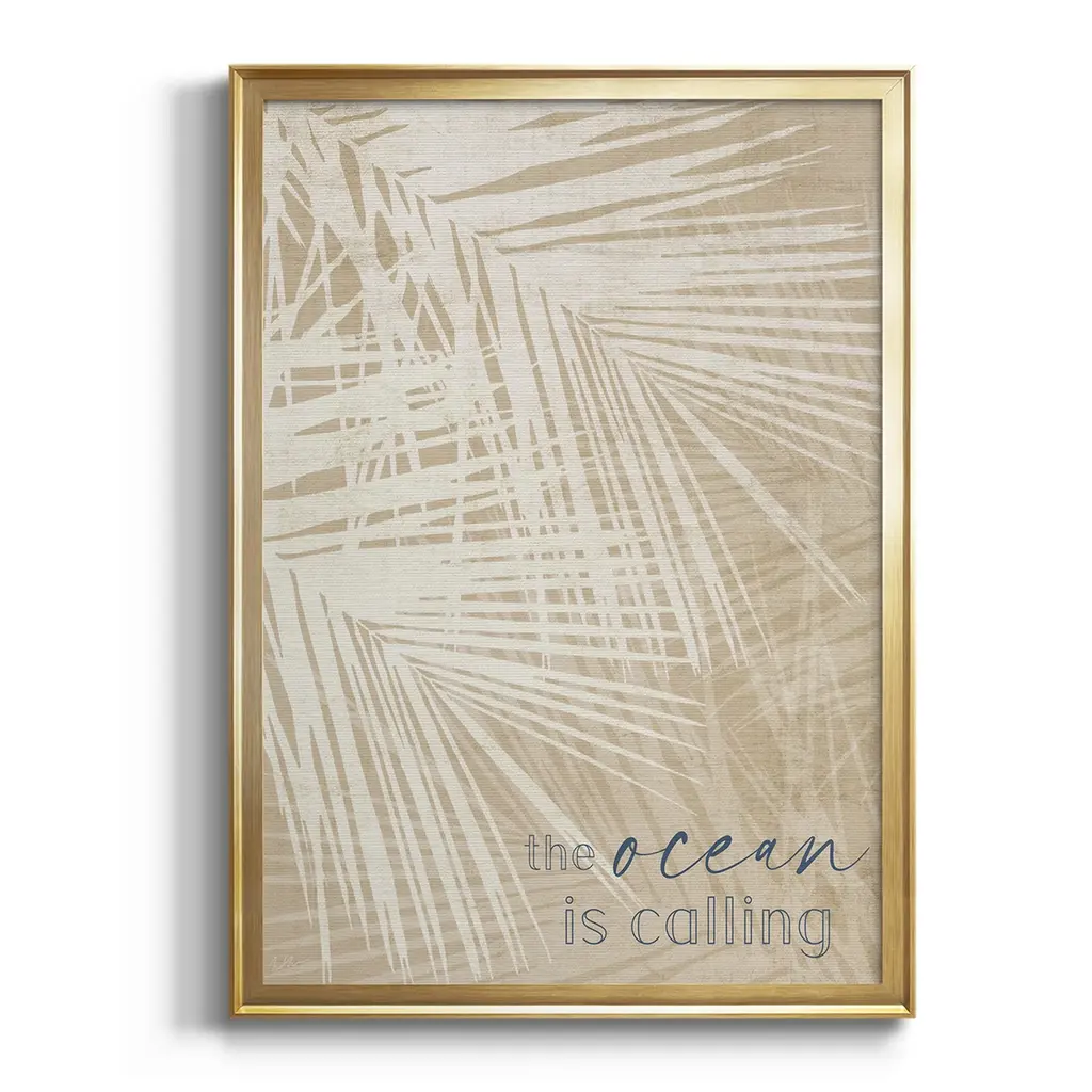Ocean Calling Palms Premium Framed Print - Ready to Hang A Premium Framed Print created to last. Framed in distressed wood and available in an array of sizes and colors Featuring a beveled a solid wood stretcher bar, each piece comes ready to hand 4 SIZES AVAILABLE 30.5''X42.5'' - Overall Size 26.5'X36.5'' - Overall Size 22.5''x30.5'' - Overall Size 18.5''x24.5'' - Overall Size Each piece is made to order. Each piece comes with hanging hardware. Made in the USA Ready to Hang