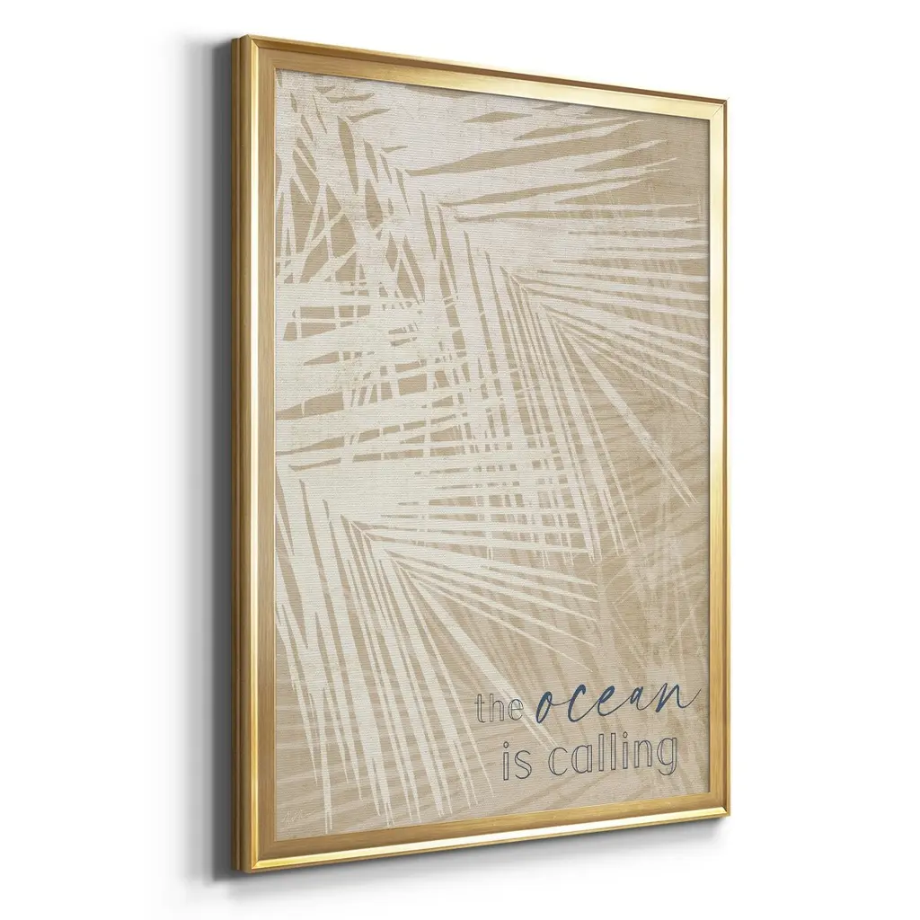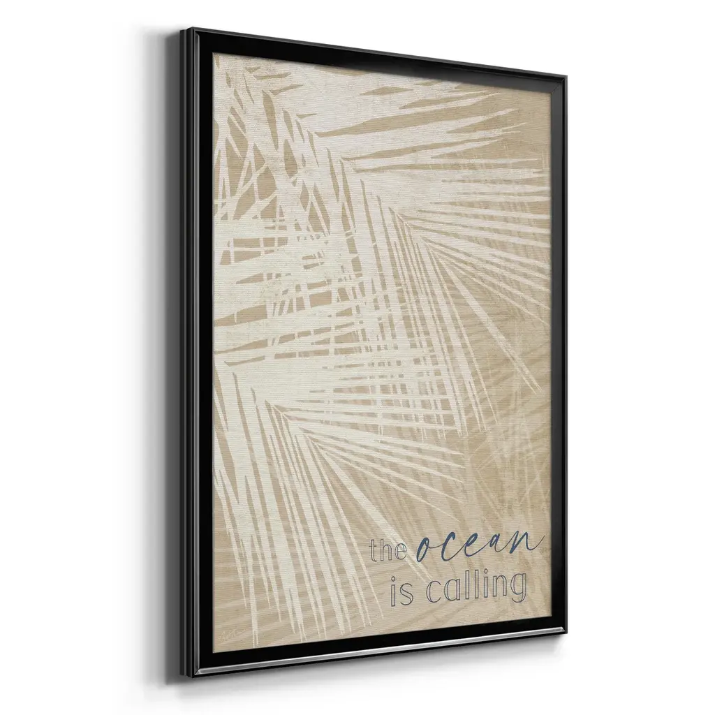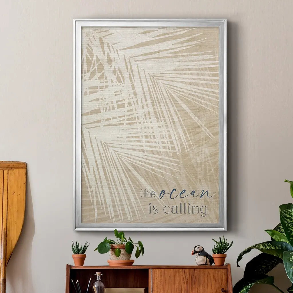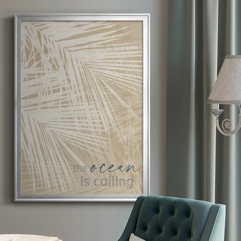 Ocean Calling Palms Premium Framed Print - Ready to Hang A Premium Framed Print created to last. Framed in distressed wood and available in an array of sizes and colors Featuring a beveled a solid wood stretcher bar, each piece comes ready to hand 4 SIZES AVAILABLE 30.5''X42.5'' - Overall Size 26.5'X36.5'' - Overall Size 22.5''x30.5'' - Overall Size 18.5''x24.5'' - Overall Size Each piece is made to order. Each piece comes with hanging hardware. Made in the USA Ready to Hang