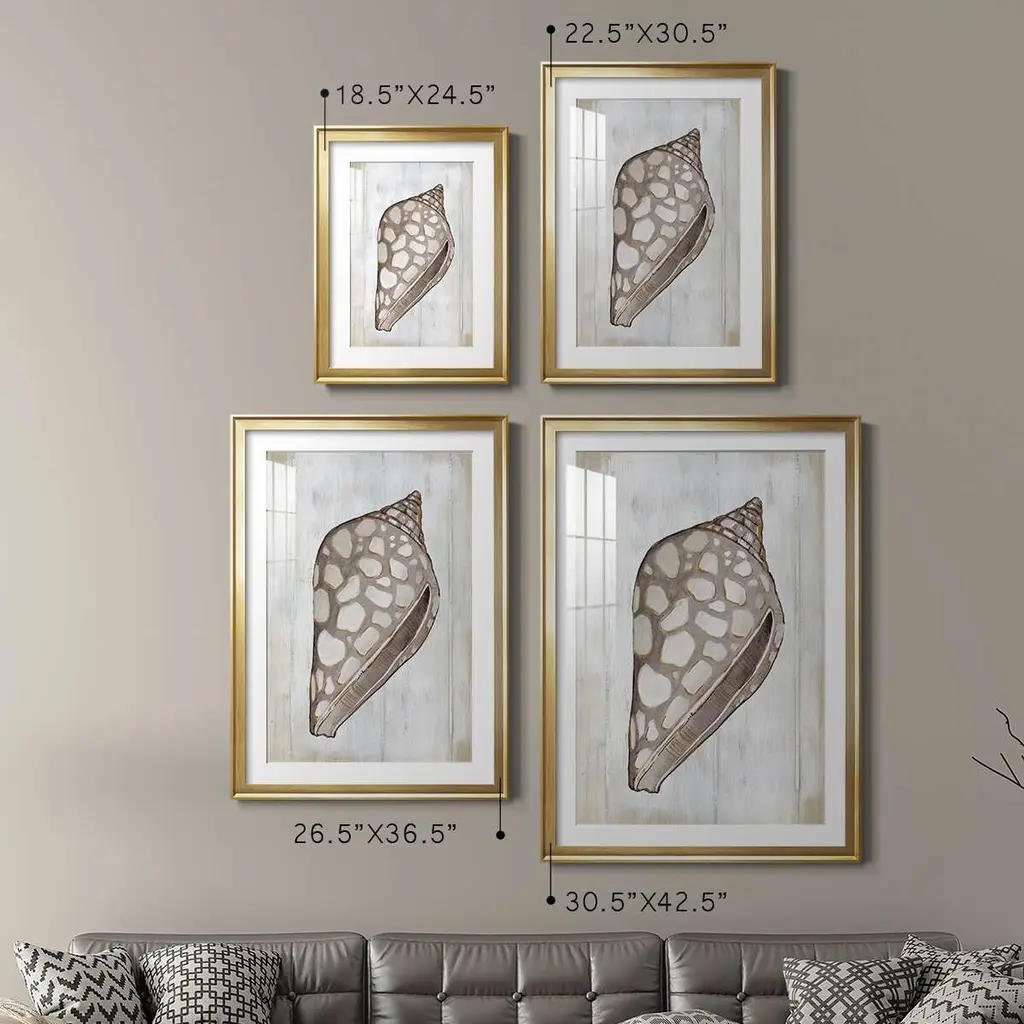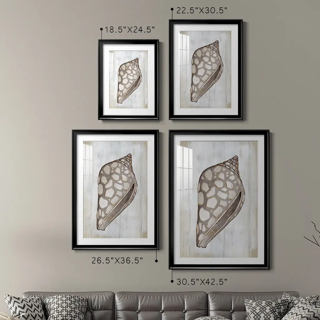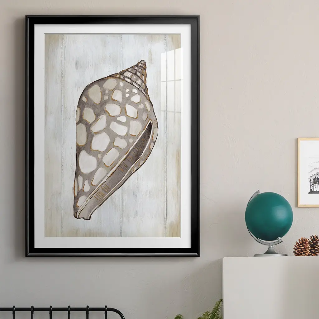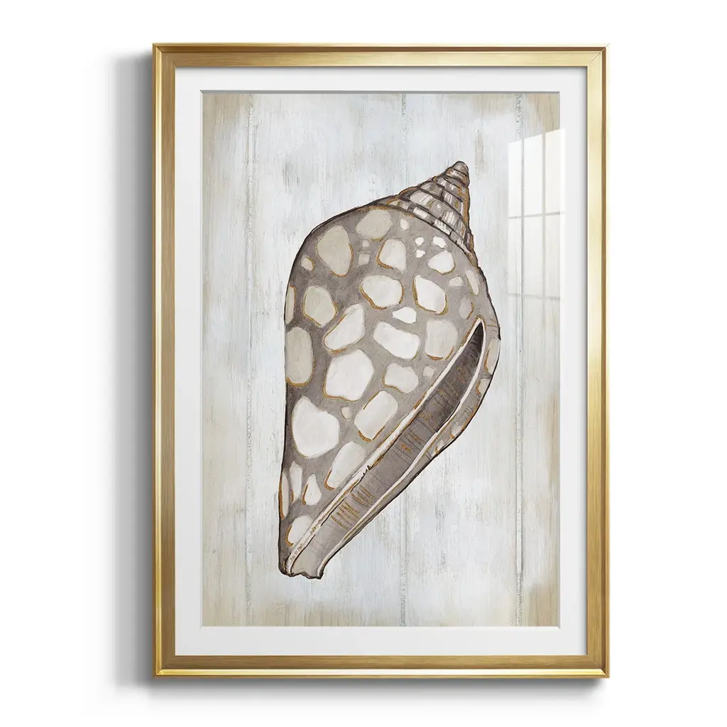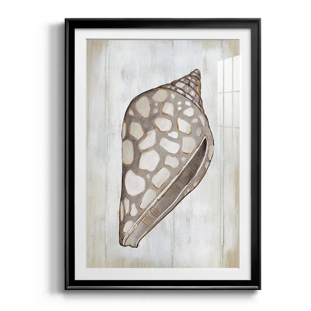 Ocean Cone I Premium Framed Print - Ready to Hang A Premium Framed Print created to last. Framed in distressed wood and available in an array of sizes and colors Featuring a beveled a solid wood stretcher bar, each piece comes ready to hand 4 SIZES AVAILABLE 30.5''X42.5'' - Overall Size 26.5'X36.5'' - Overall Size 22.5''x30.5'' - Overall Size 18.5''x24.5'' - Overall Size Each piece is made to order. Each piece comes with hanging hardware. Made in the USA Ready to Hang Giclee Paper Print Acrylic Glass Beveled Matt Board