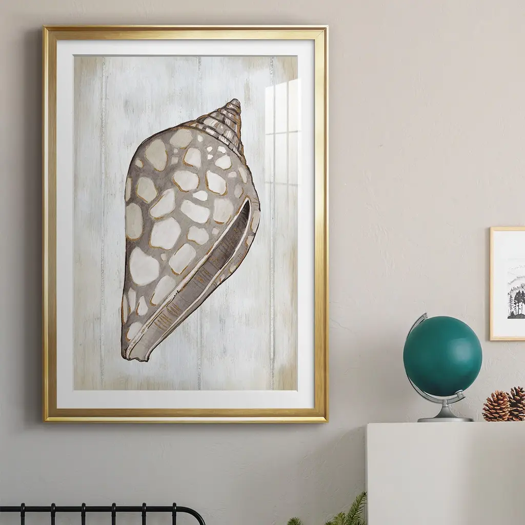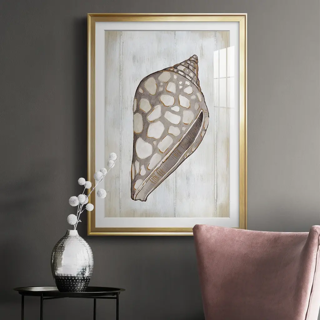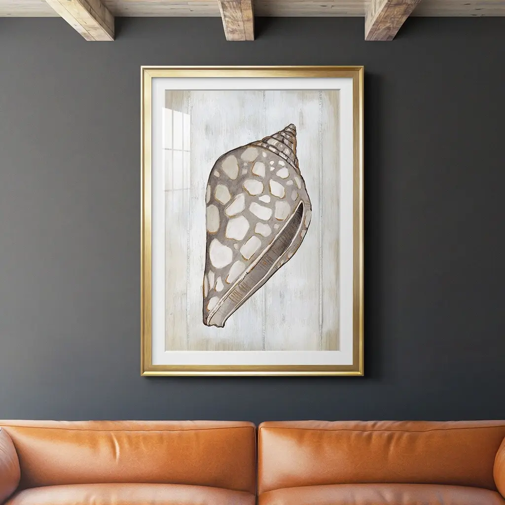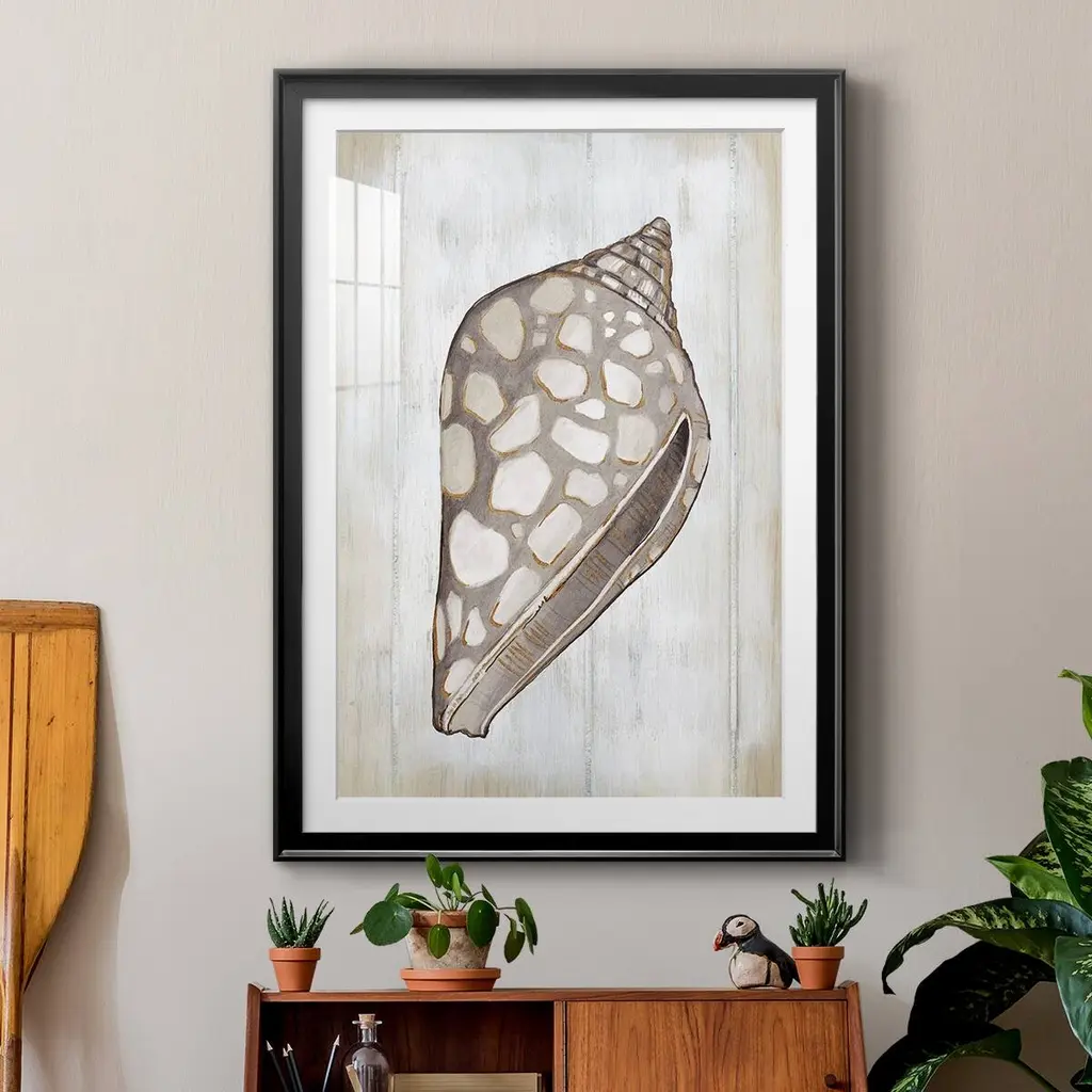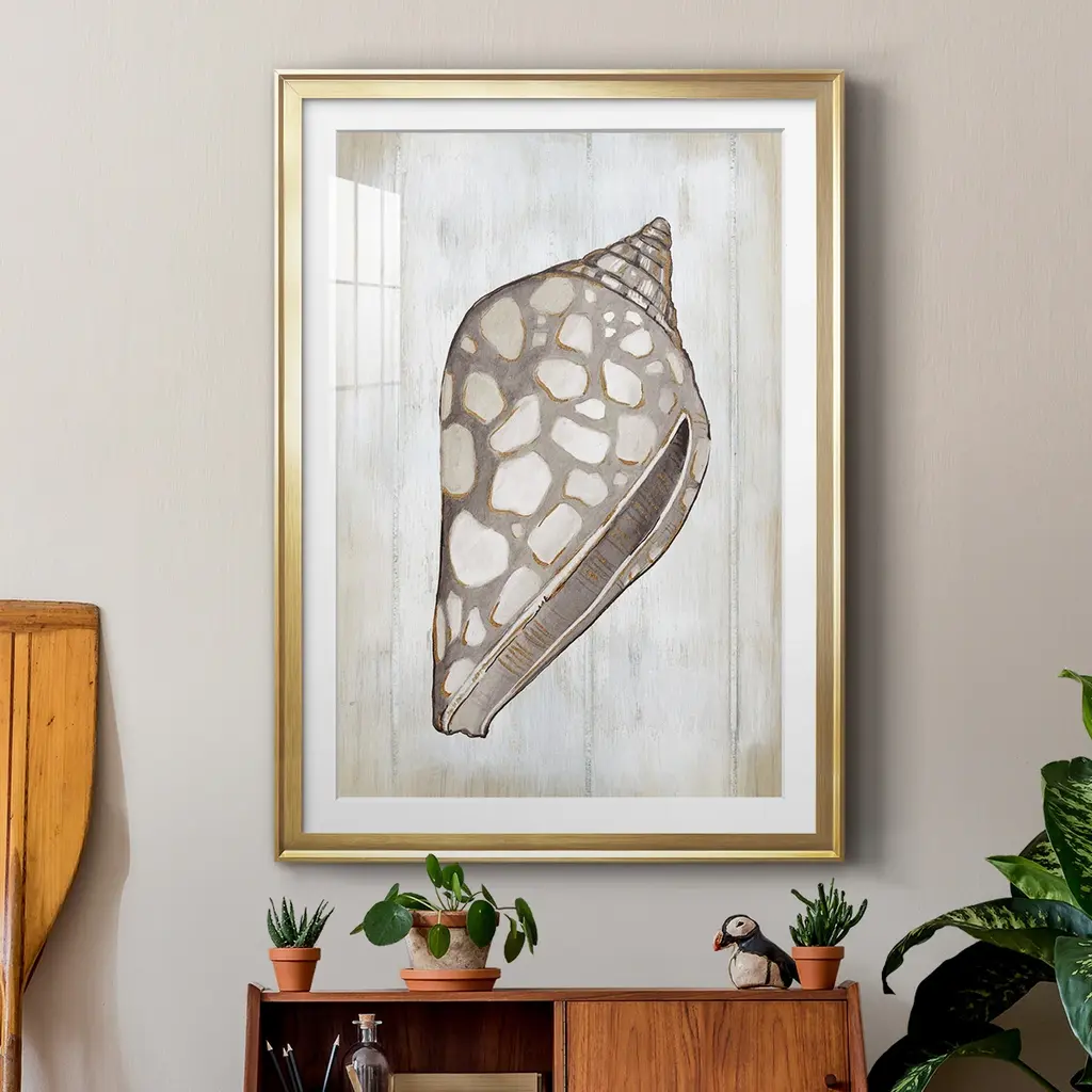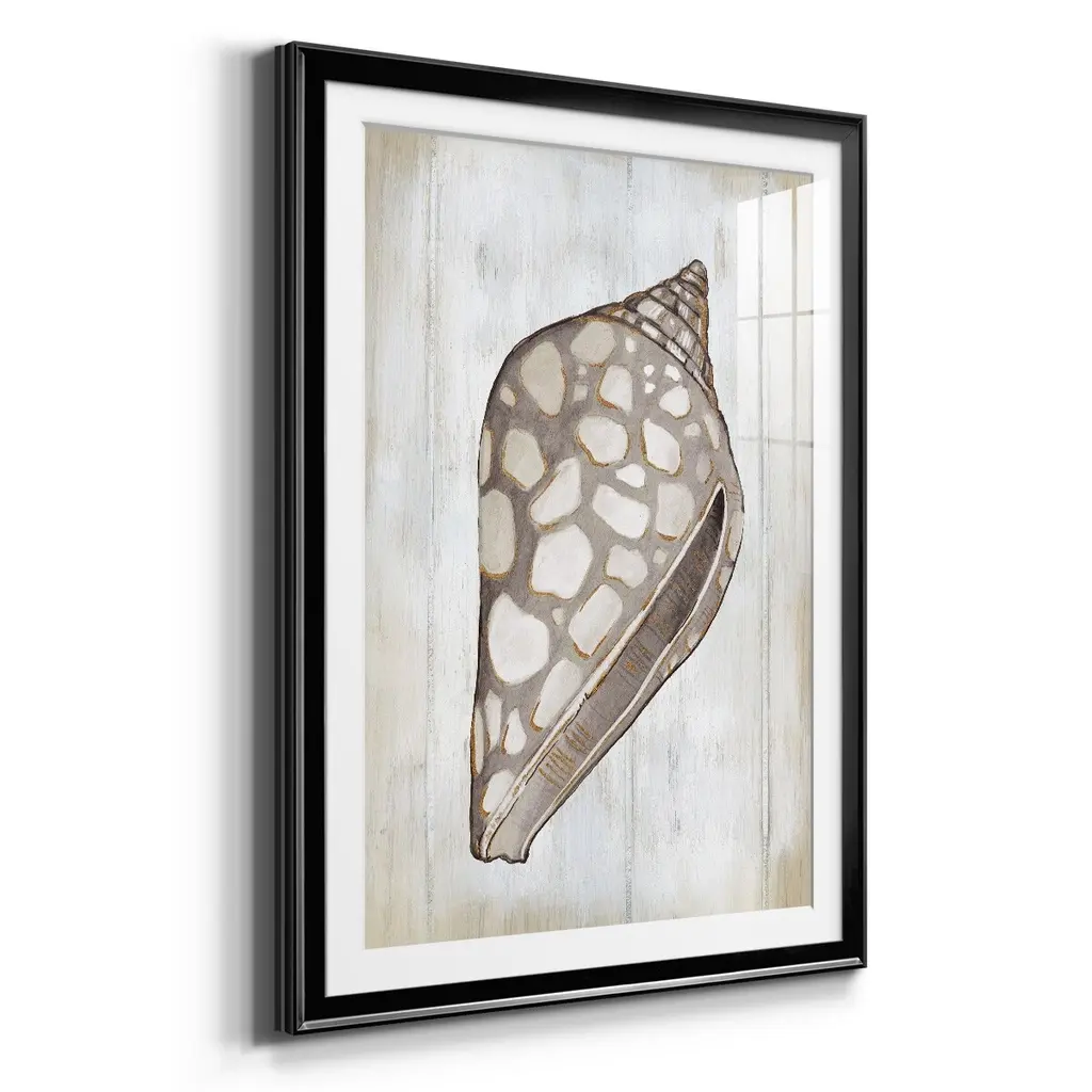 Ocean Cone I Premium Framed Print - Ready to Hang A Premium Framed Print created to last. Framed in distressed wood and available in an array of sizes and colors Featuring a beveled a solid wood stretcher bar, each piece comes ready to hand 4 SIZES AVAILABLE 30.5''X42.5'' - Overall Size 26.5'X36.5'' - Overall Size 22.5''x30.5'' - Overall Size 18.5''x24.5'' - Overall Size Each piece is made to order. Each piece comes with hanging hardware. Made in the USA Ready to Hang Giclee Paper Print Acrylic Glass Beveled Matt Board