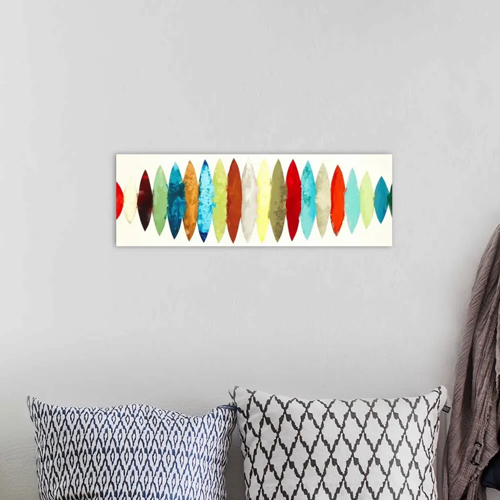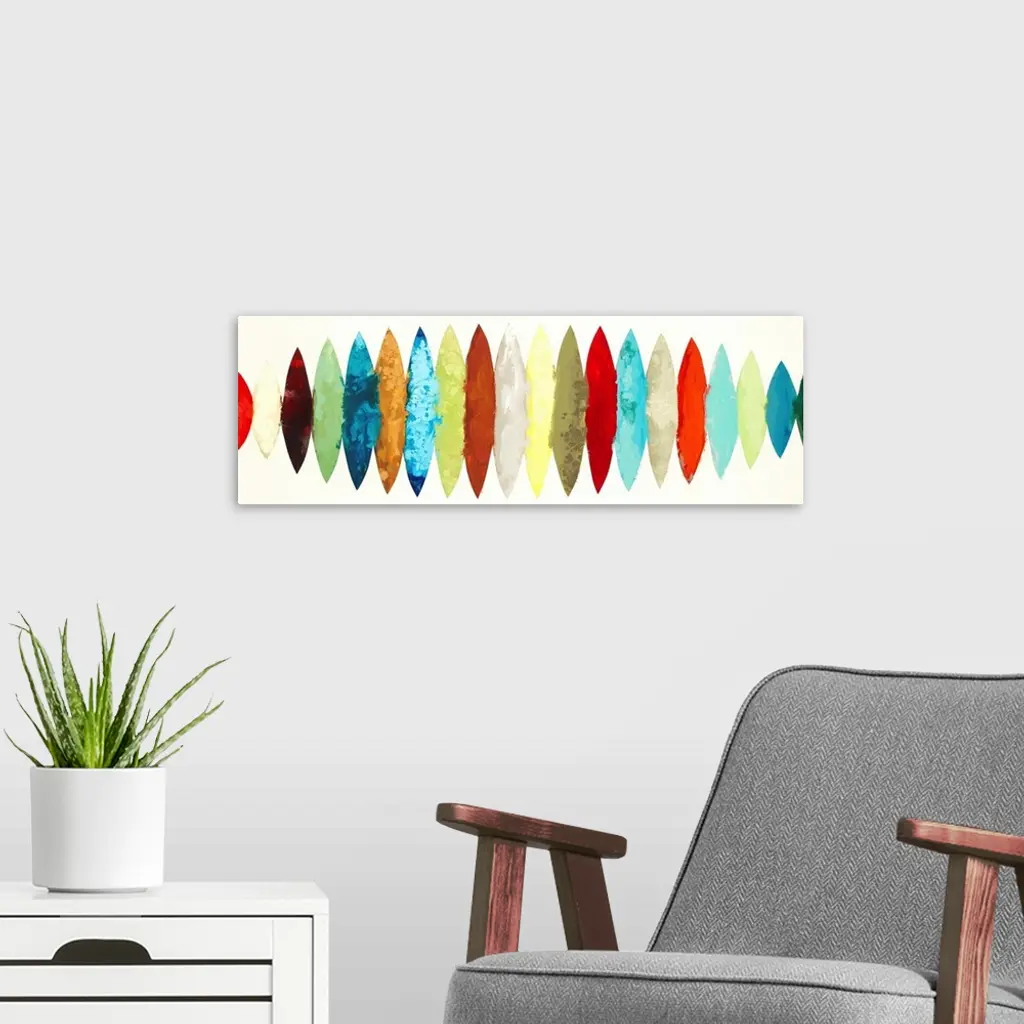 Panoramic abstract painting with different colored oblong shapes lined up together going across the center with their colors bleeding in to each other.