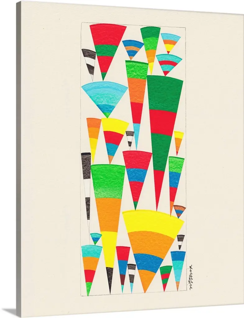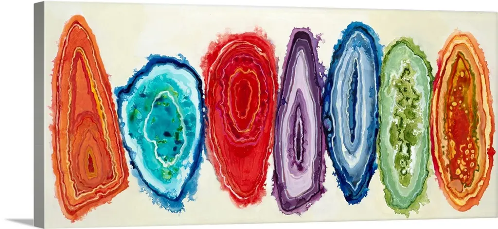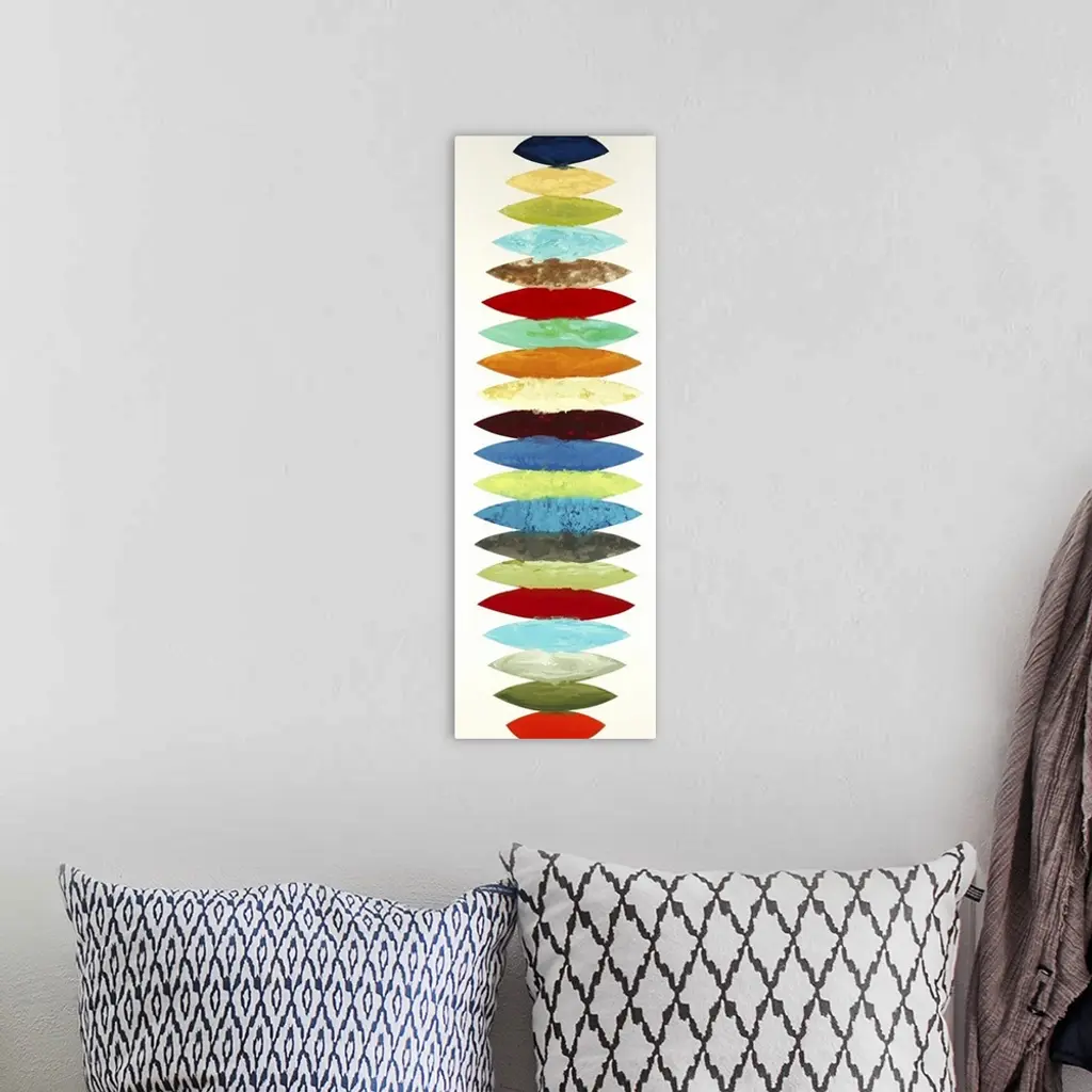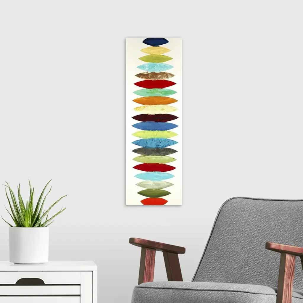 Vertical panoramic abstract painting with different colored oblong shapes lined up together going across the center with their colors bleeding in to each other.