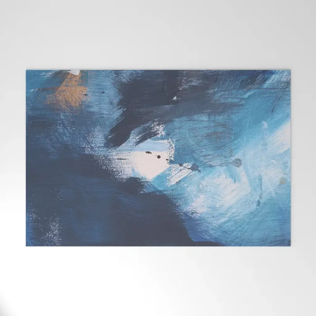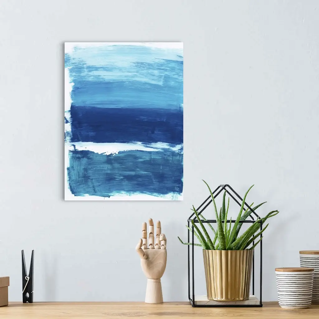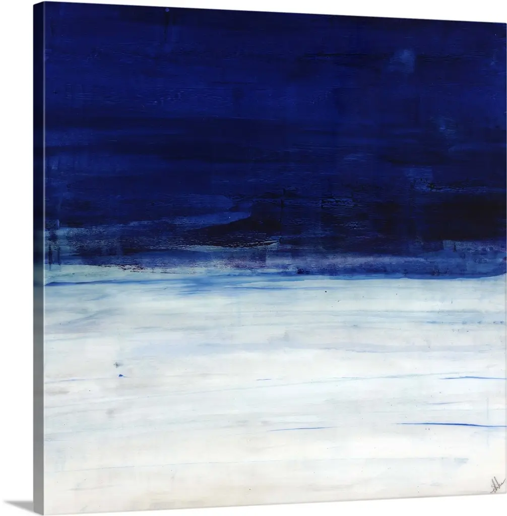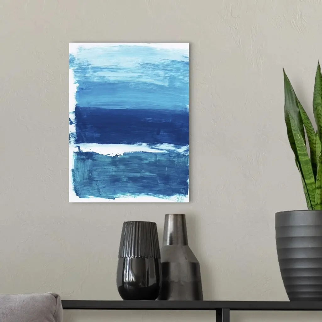 Vertical abstract landscape painting of an ocean using horizontal, broad brush strokes in blue and white.