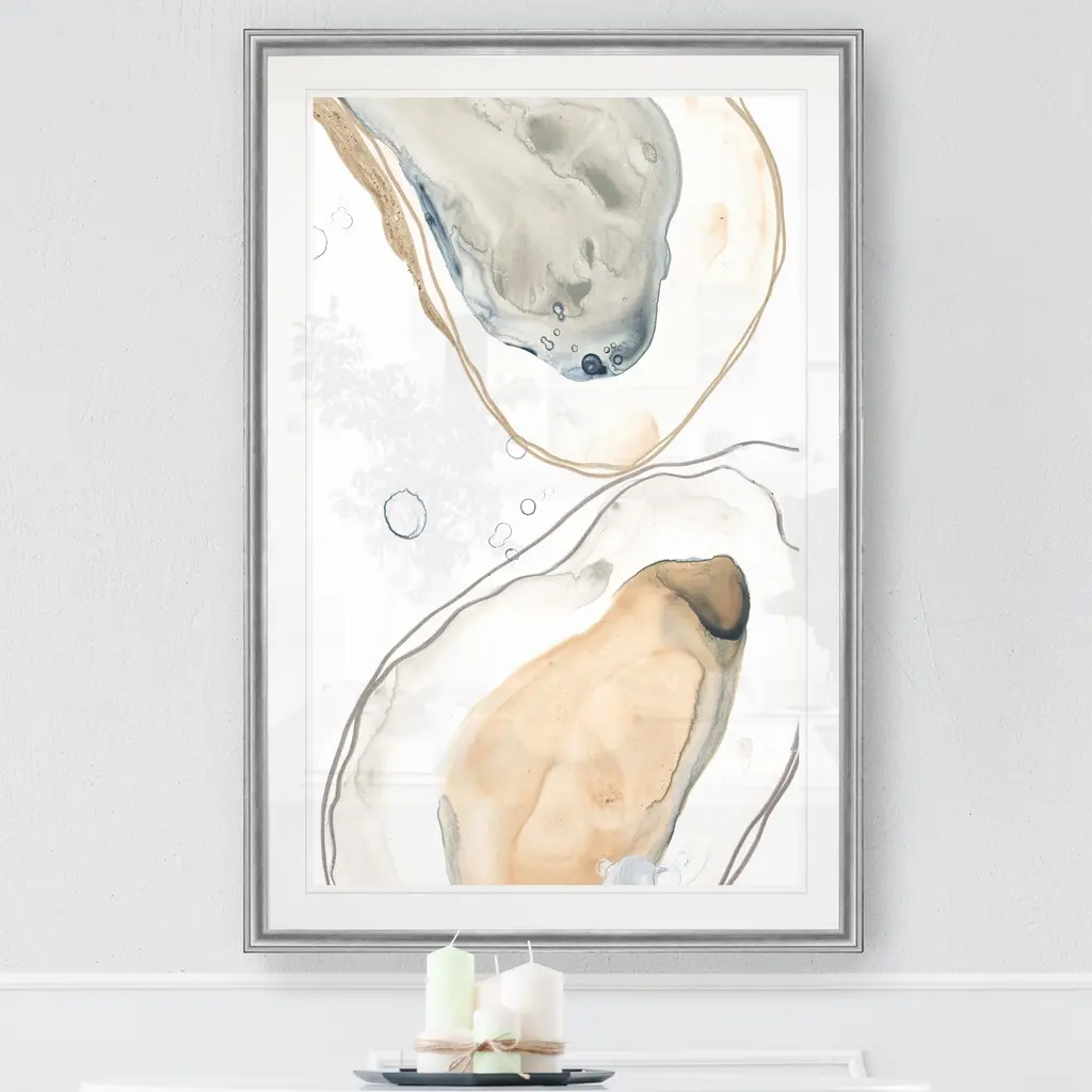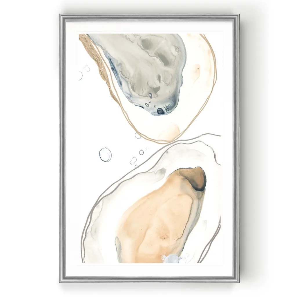Ocean Oysters IV -Custom Framed Print A premium custom framed giclee print Featuring a beveled a matt , acrylic glass, and a high quality giclee print 4 SIZES AVAILABLE 18''x24''- Overall Size 22''x30'' - Overall Size 26''x36''' - Overall Size 30''x42''' - Overall Size Each piece is made to order. Built to Last Each piece comes ready to hang Fade and Water resistant Made domestically