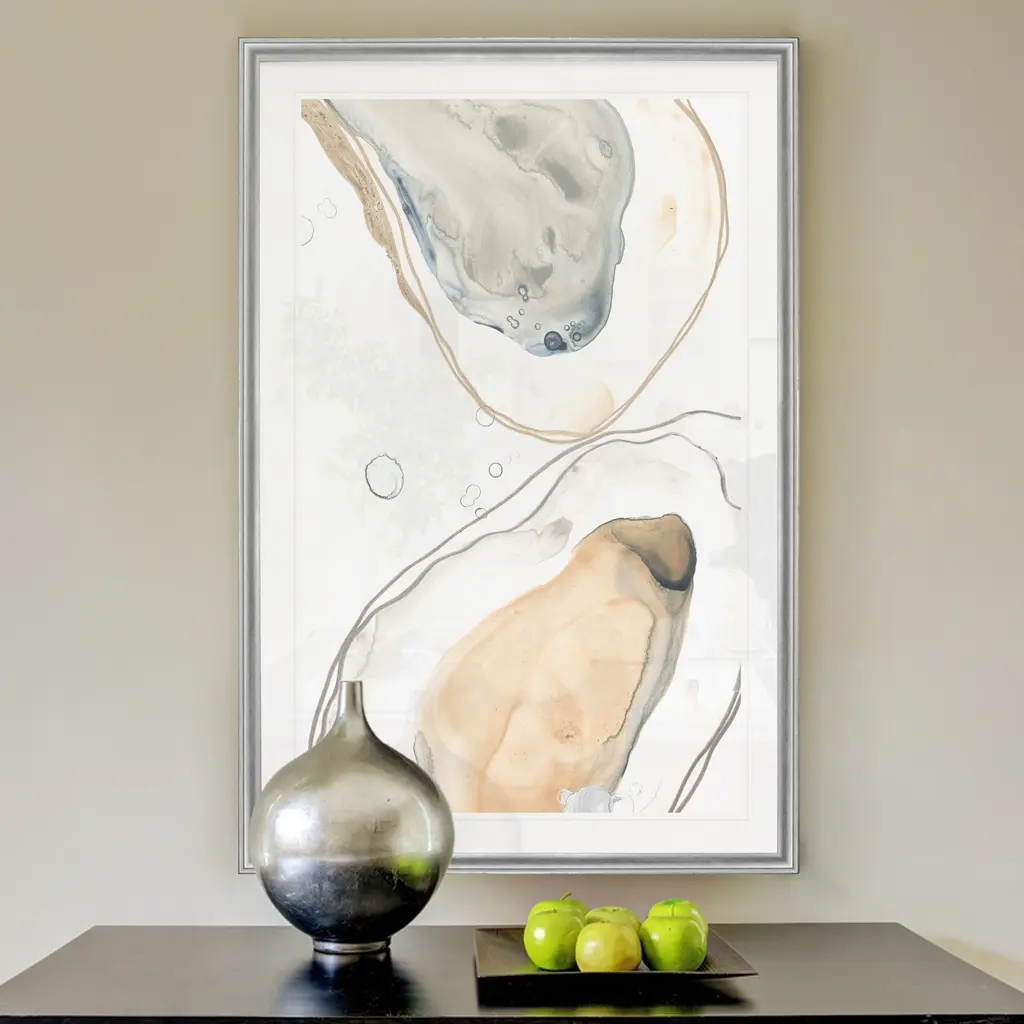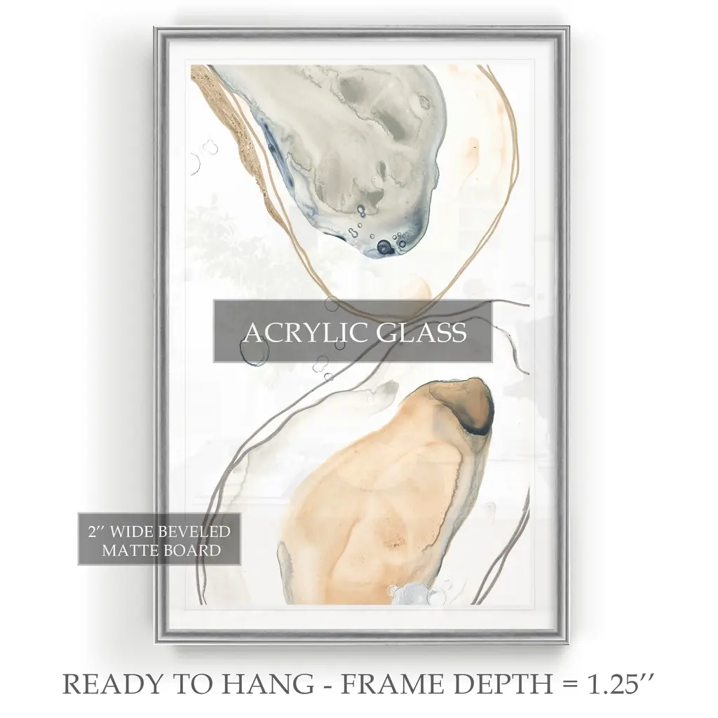 Ocean Oysters IV -Custom Framed Print A premium custom framed giclee print Featuring a beveled a matt , acrylic glass, and a high quality giclee print 4 SIZES AVAILABLE 18''x24''- Overall Size 22''x30'' - Overall Size 26''x36''' - Overall Size 30''x42''' - Overall Size Each piece is made to order. Built to Last Each piece comes ready to hang Fade and Water resistant Made domestically