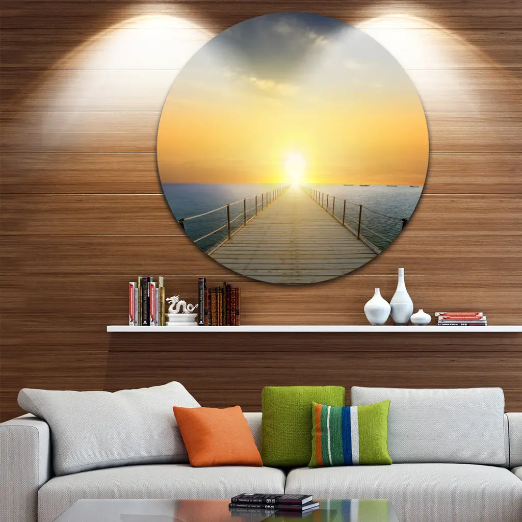 Bring Contemporary Abstraction to your home with this large Circle Metal wall art. This Ocean Sunset with Pier Metal Artwork makes it the focal point of any room or office. - White Gloss Coating ensures colors are extra vibrant with light reflection.- Aluminum grade Sheet Metal with 1 inch mounting frame on the back giving the illusion that the artwork is floating on the wall..- Mounting Brackets are included along with instructions.- High Quality Digital images are created directly into a glossy aluminum panel producing a stunning and captivating print into the glossy finish of the metal.- Water, Fire and Scratch resistant HD Aluminum panels.- Looks better than any photo paper and guaranteed to last at least 20 years- Easy to clean with a microfiber cloth. Colors are far superior to regular Canvas Art. - Easy to Hang