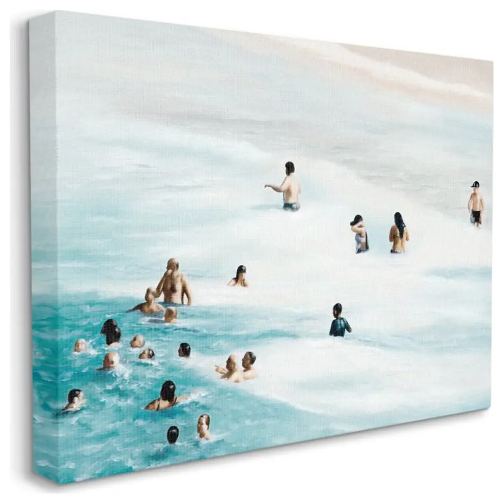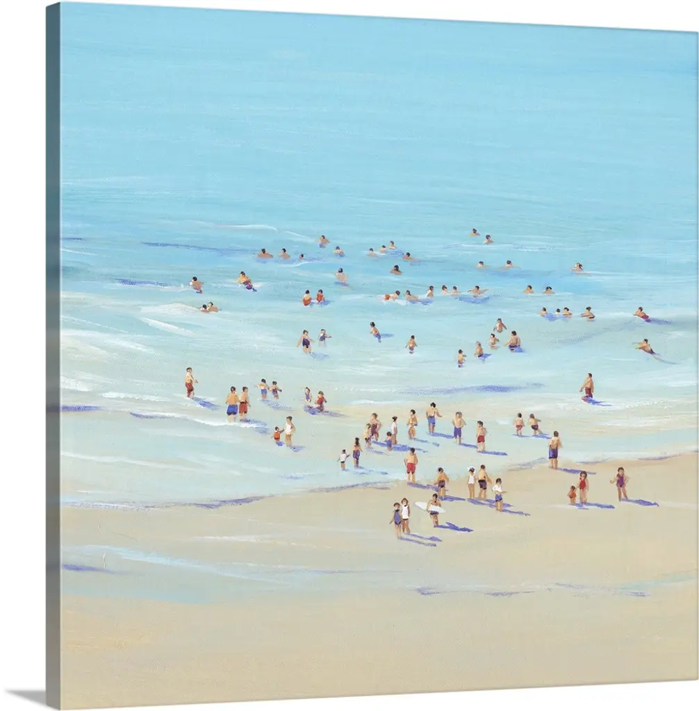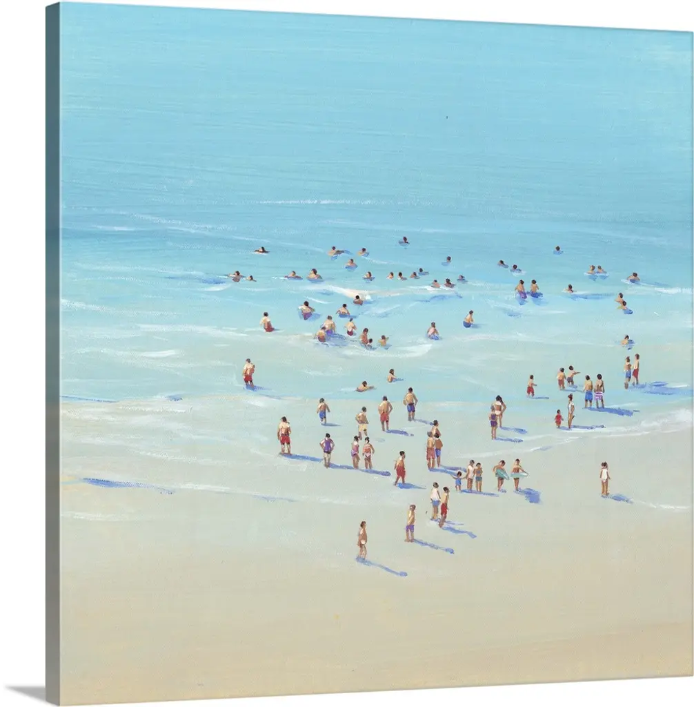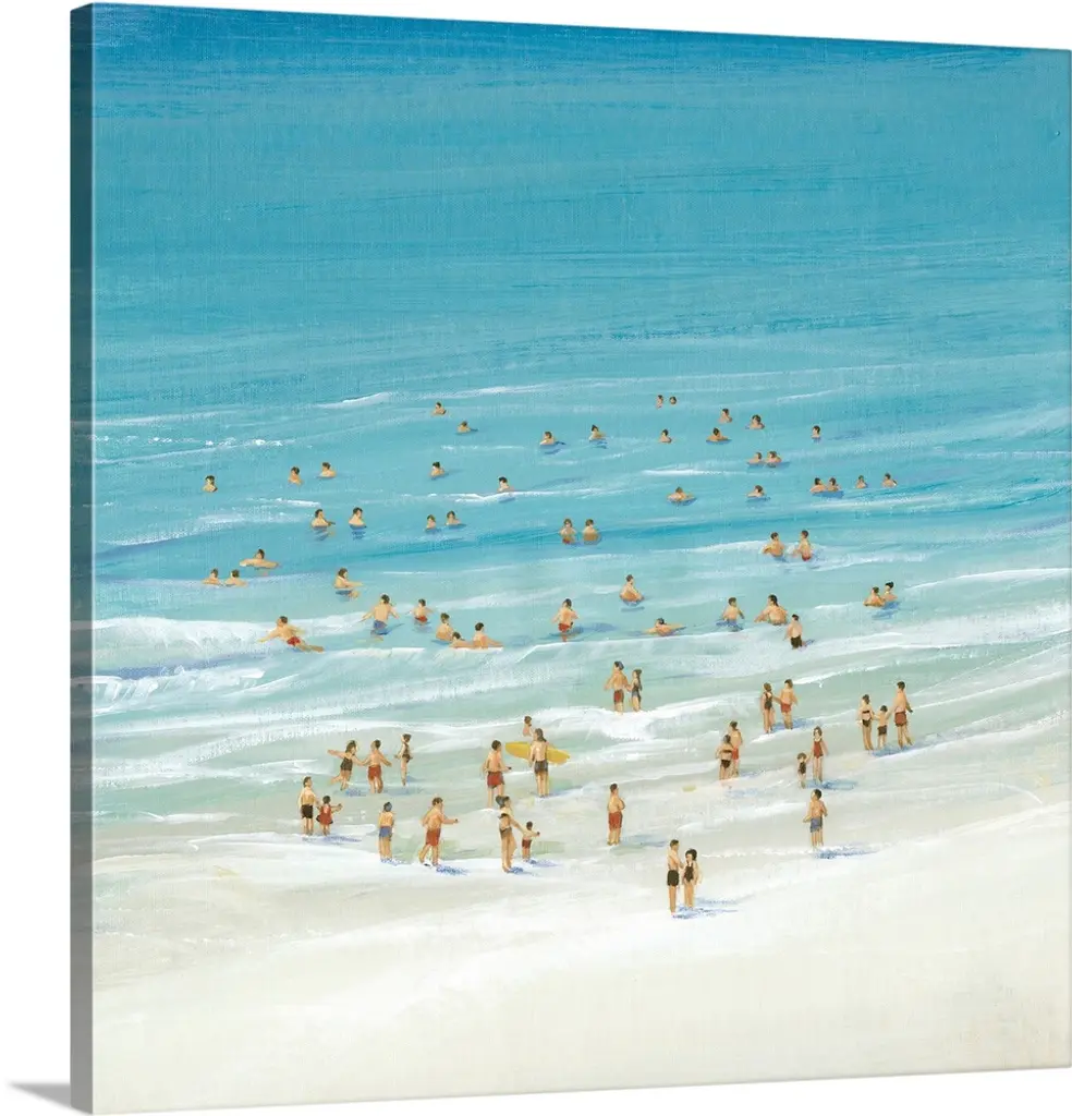 Painting of an aerial view of several beachgoers playing in the ocean.