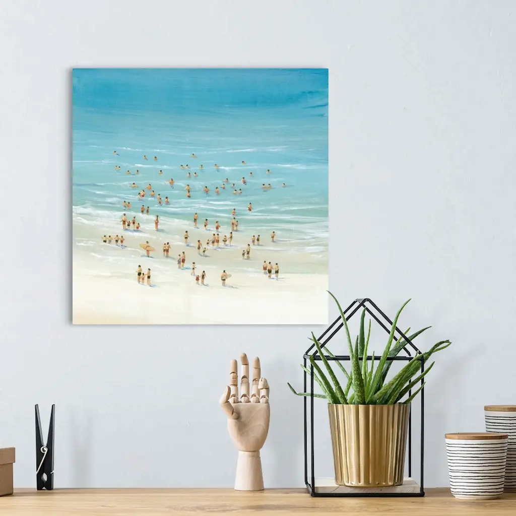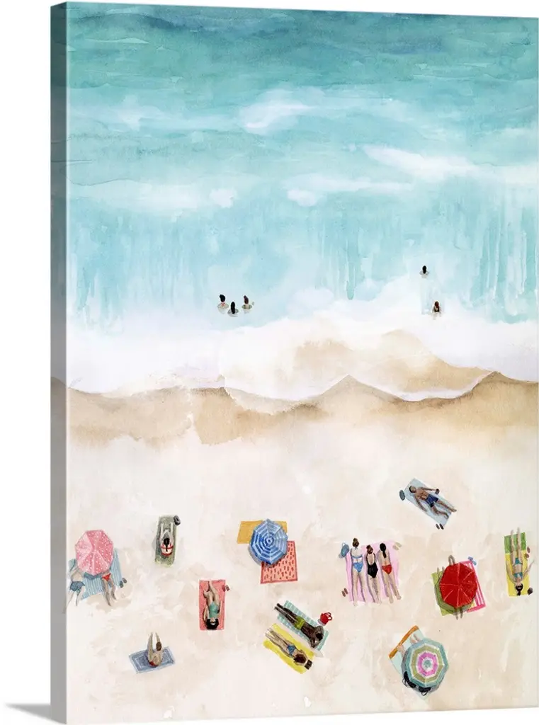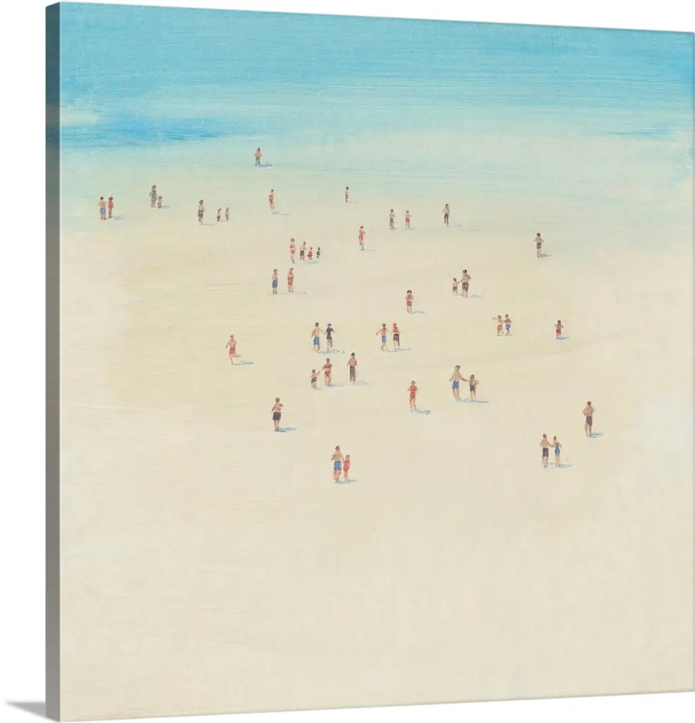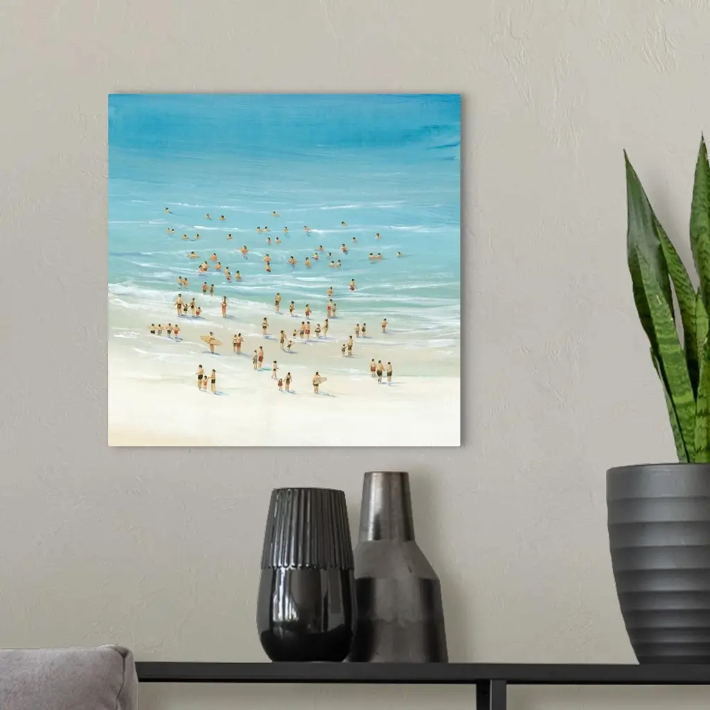 Painting of an aerial view of several beachgoers playing in the ocean.