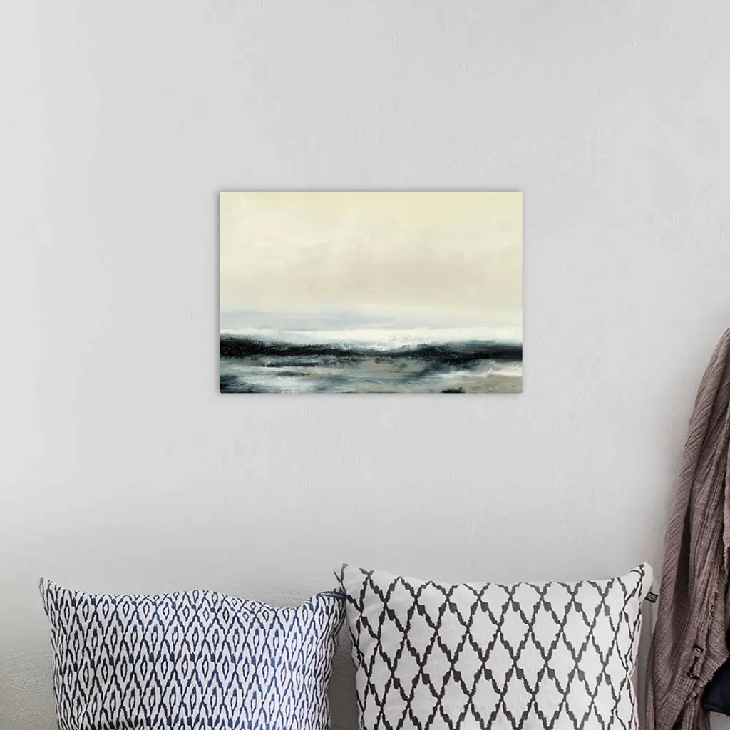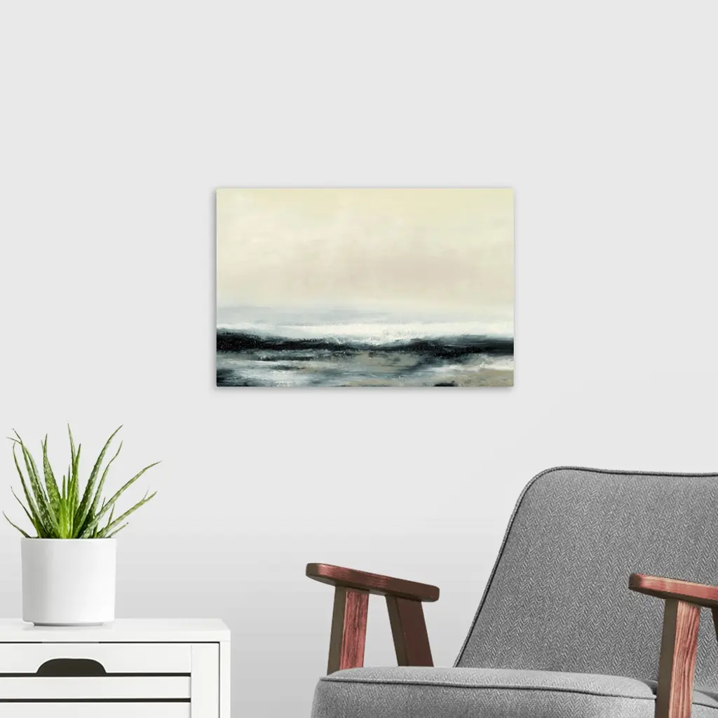 Contemporary oceanscape painting of dark seawater under a pale sky.
