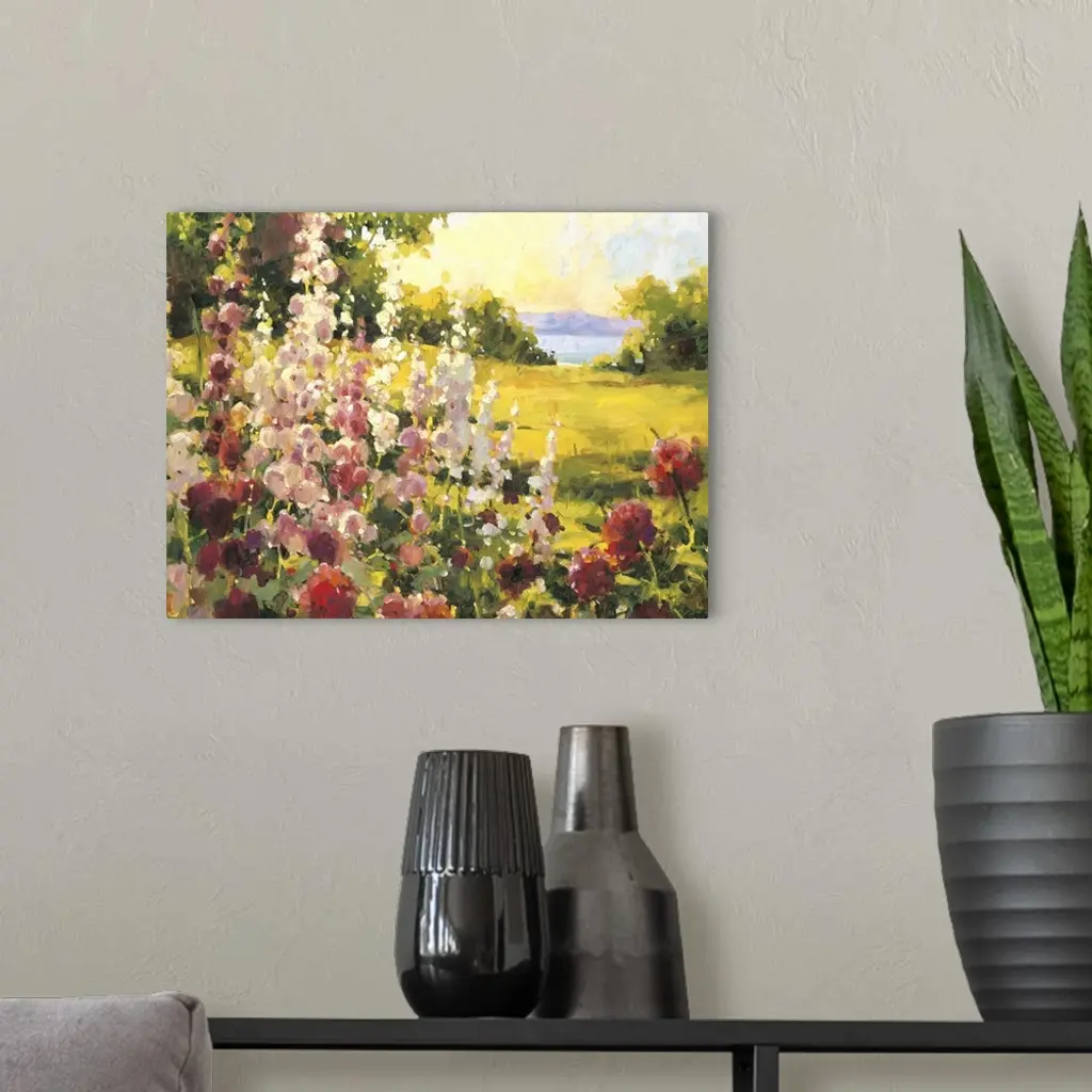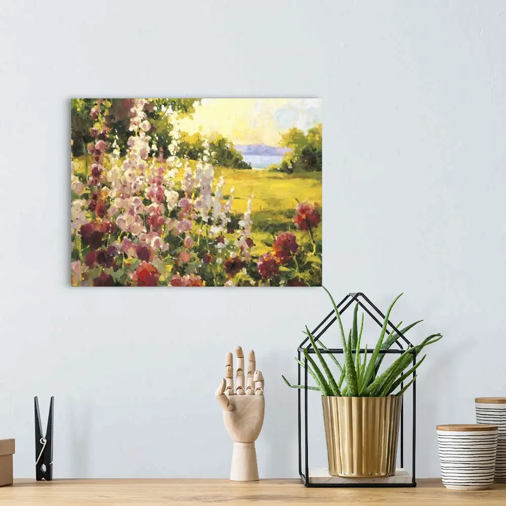 Contemporary painting of a field of wildflowers looking out to an ocean view.