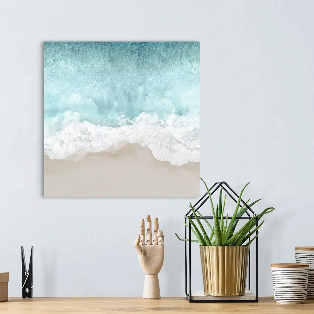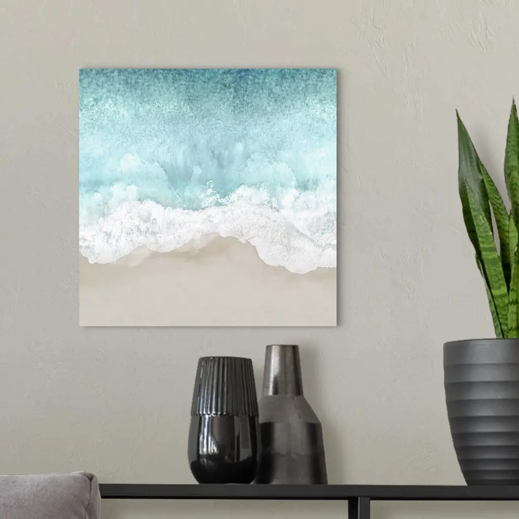 One artwork in a series of aerial shots of a beach as light blue waves break upon the shore.