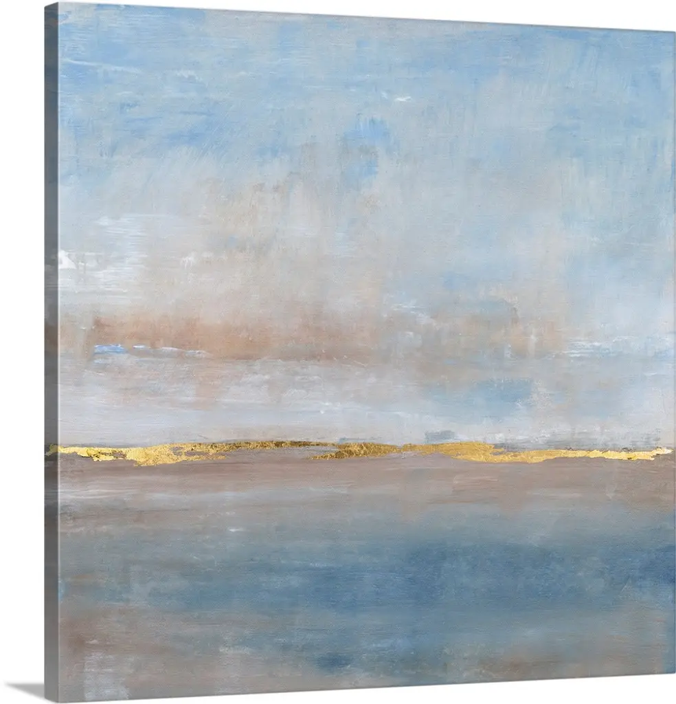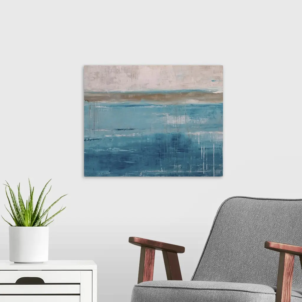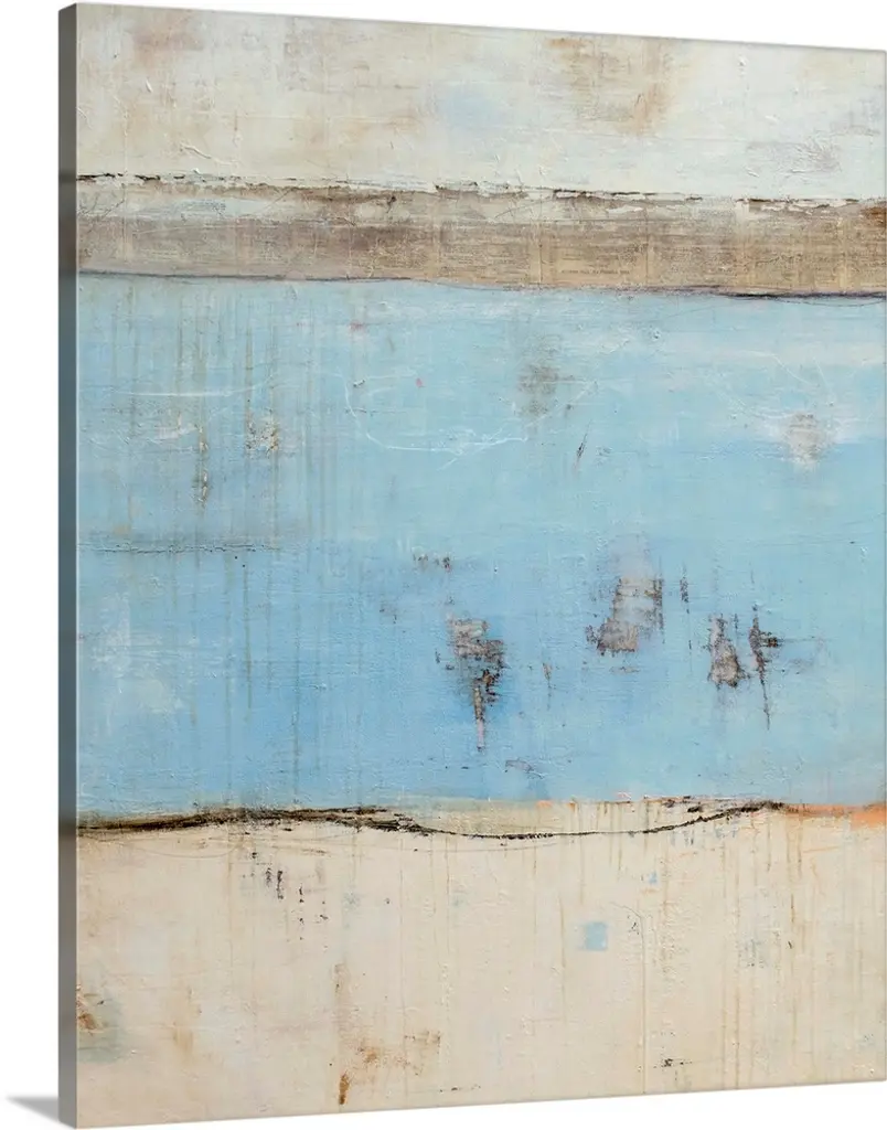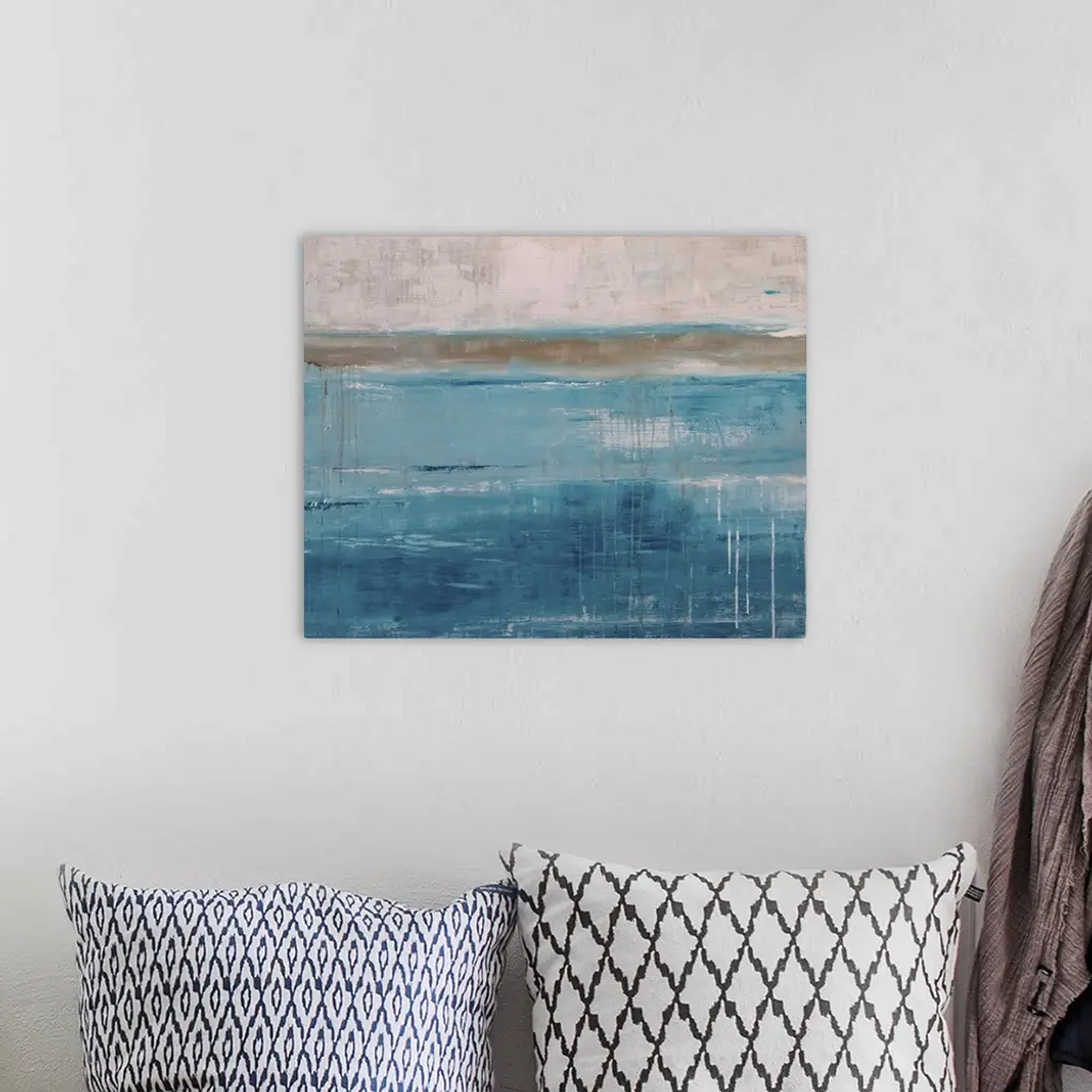 A square contemporary abstract painting with a heavy blue tone throughout, accompanied by tan and white hues underneath creating drips to the bottom.
