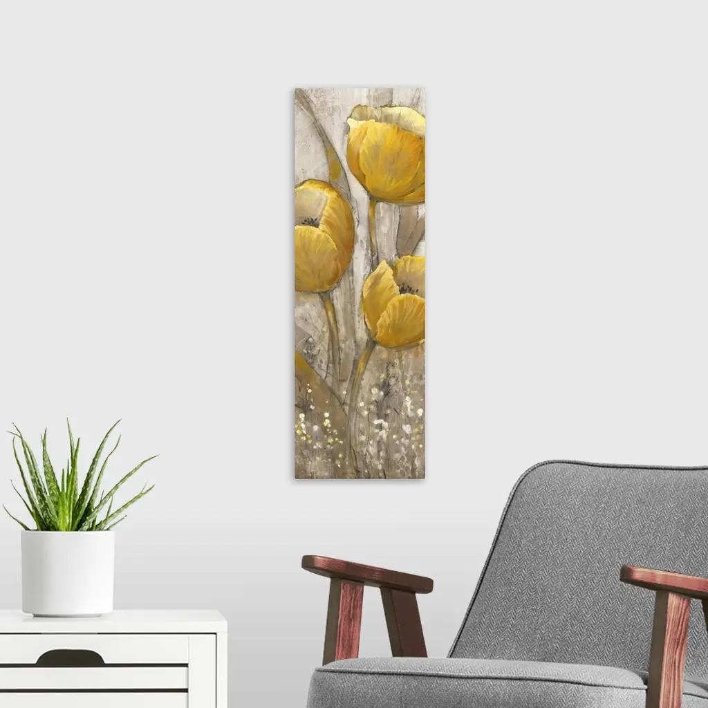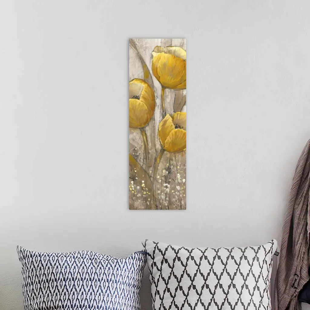 Contemporary painting of ochre yellow tulips against a neutral background.