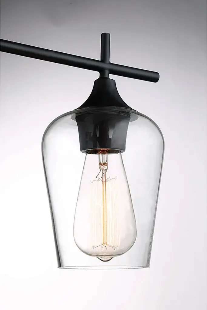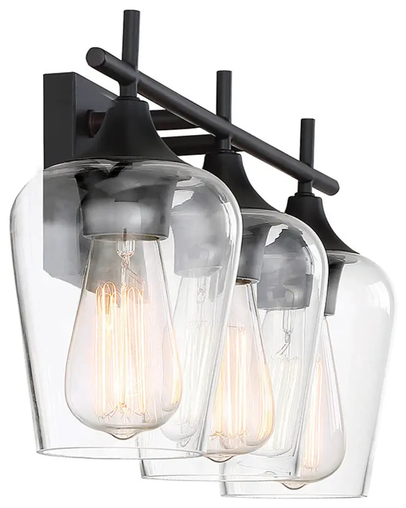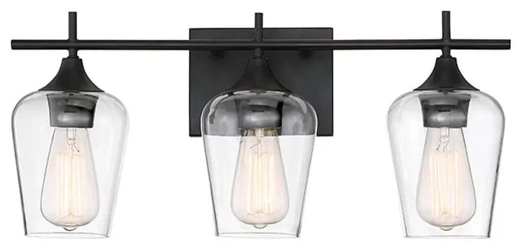 The Octave vanity fixture from Savoy House has understated elegance, featuring large curved shades of clear glass, minimal detailing and an English bronze finish.Extends: 5"Voltage: 120Bulbs included: NoNumber of bulbs: 3Type of bulbs: EMax. wattage per bulb: 100Safety rating: UL, CULInstall direction: ReversibleFinish: English bronzeMaterials: Metal and glassDimensions: W 20.88" x D 5.88" x H 9.5"