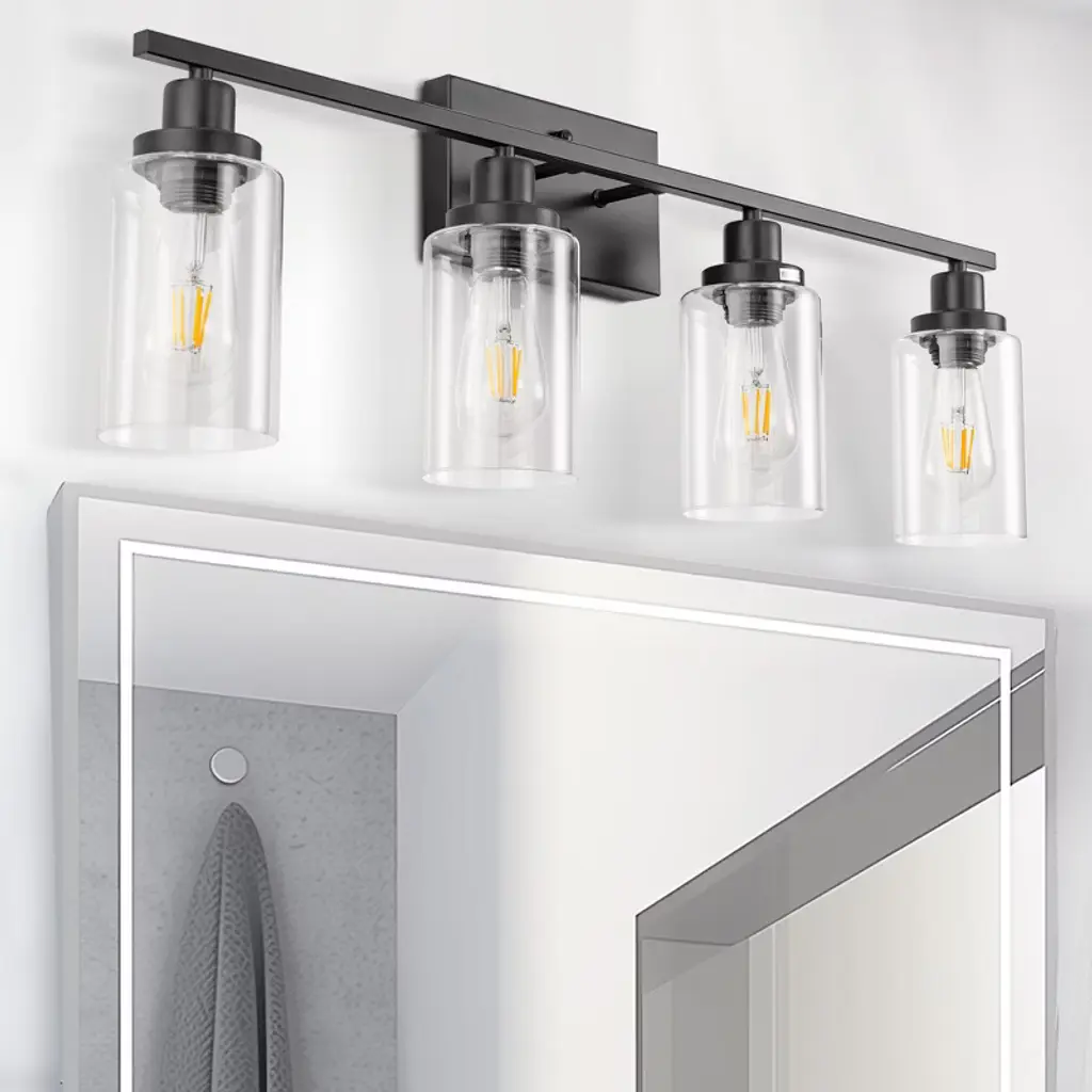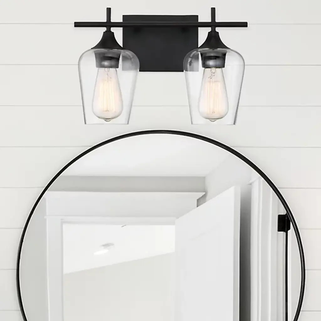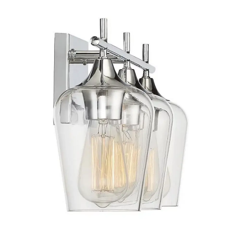 A refined design worthy of transitional or contemporary bath spaces. The Octave Vanity Light by Savoy House combines glass and metal to create a striking contrast. Transparent glass shades are held to a rectangular backplate by means of conical collars with short stems and a crossbar. This fixture is designed to accommodate incandescent bulbs of your choice and can be installed to direct the light either in the upward or downward direction for a tailored display.