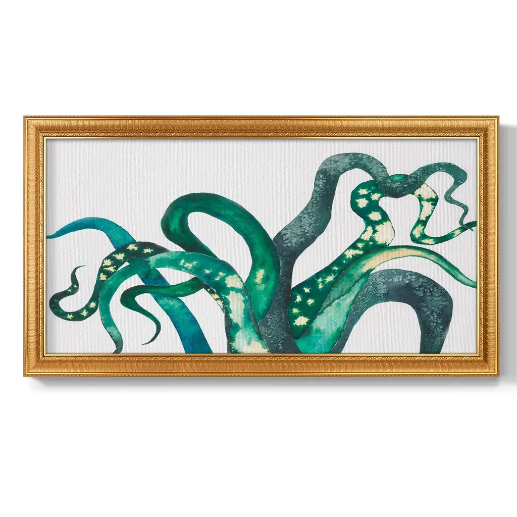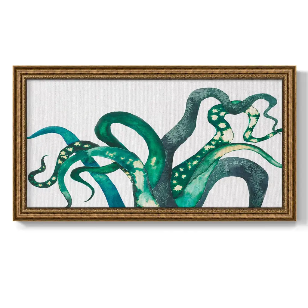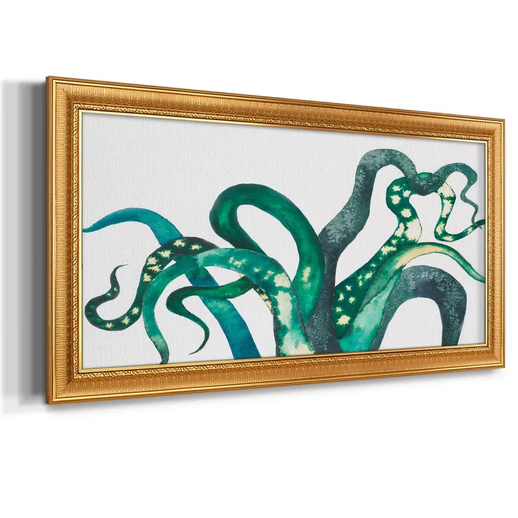 Octo Legs Premium Framed Canvas- Ready to Hang A Premium Framed Canvas created to last. Framed in distressed wood and available in an array of sizes and colors Featuring a beveled a solid wood stretcher bar, each piece comes ready to hand 3 SIZES AVAILABLE 21''X37'' - Overall Size 25''X45'' - Overall Size 29''x53'' - Overall Size Each piece is made to order. Each piece comes with hanging hardware. Made in the USA Ready to Hang Giclee Paper Print Acrylic Glass Beveled Matt Board