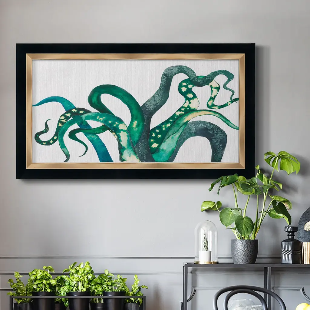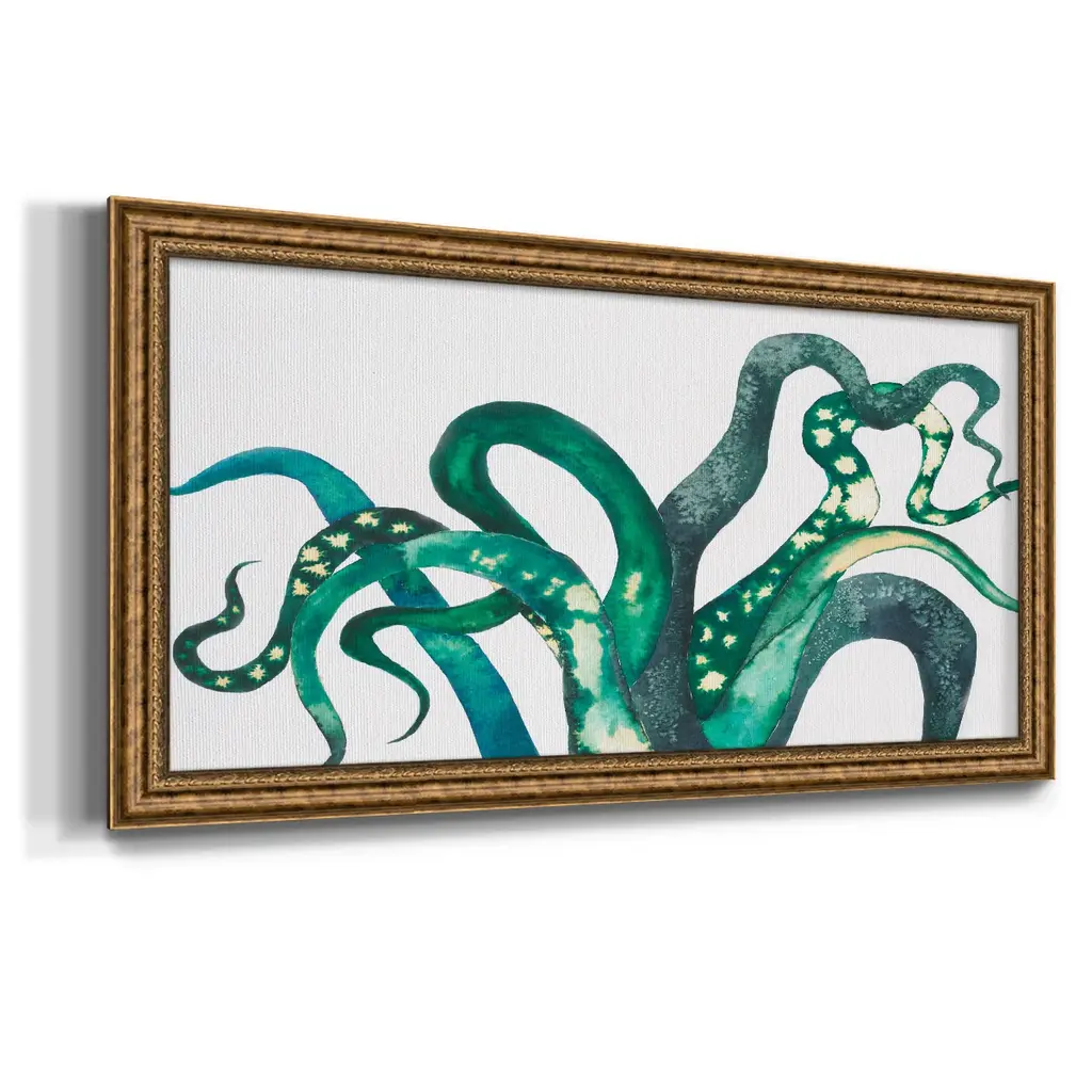 Octo Legs Premium Framed Canvas- Ready to Hang A Premium Framed Canvas created to last. Framed in distressed wood and available in an array of sizes and colors Featuring a beveled a solid wood stretcher bar, each piece comes ready to hand 3 SIZES AVAILABLE 21''X37'' - Overall Size 25''X45'' - Overall Size 29''x53'' - Overall Size Each piece is made to order. Each piece comes with hanging hardware. Made in the USA Ready to Hang Giclee Paper Print Acrylic Glass Beveled Matt Board