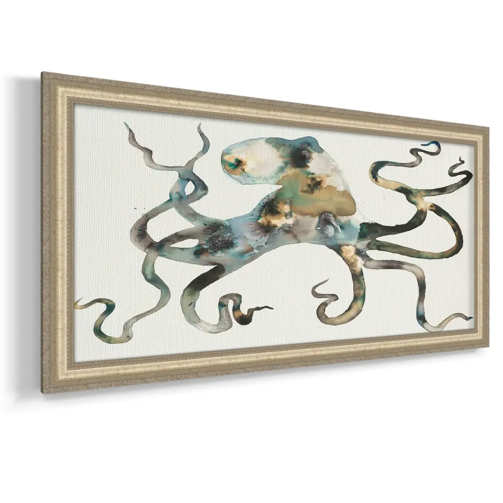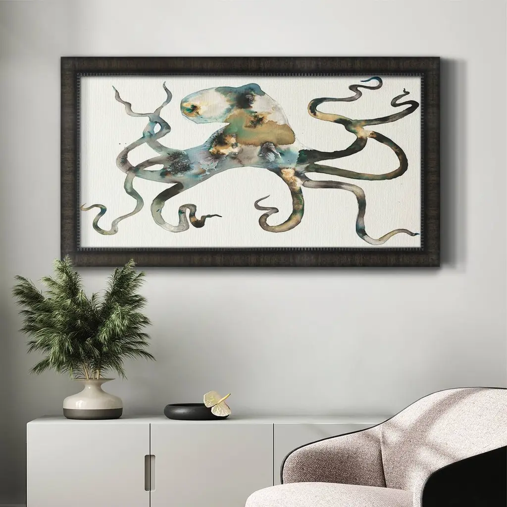 Octo Premium Framed Canvas- Ready to Hang A Premium Framed Canvas created to last. Framed in distressed wood and available in an array of sizes and colors Featuring a beveled a solid wood stretcher bar, each piece comes ready to hand 3 SIZES AVAILABLE 21''X37'' - Overall Size 25''X45'' - Overall Size 29''x53'' - Overall Size Each piece is made to order. Each piece comes with hanging hardware. Made in the USA Ready to Hang Giclee Paper Print Acrylic Glass Beveled Matt Board