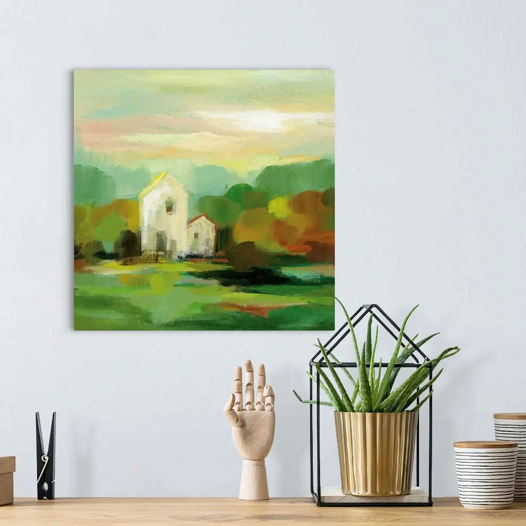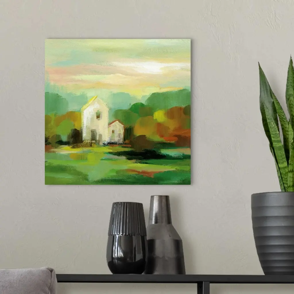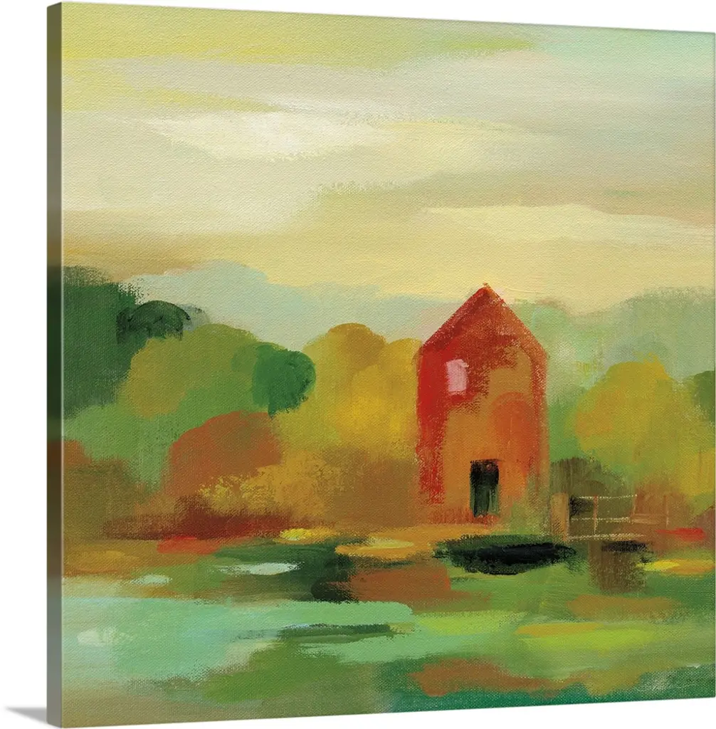 Contemporary landscape painting with a white barn house and Autumn colored trees.
