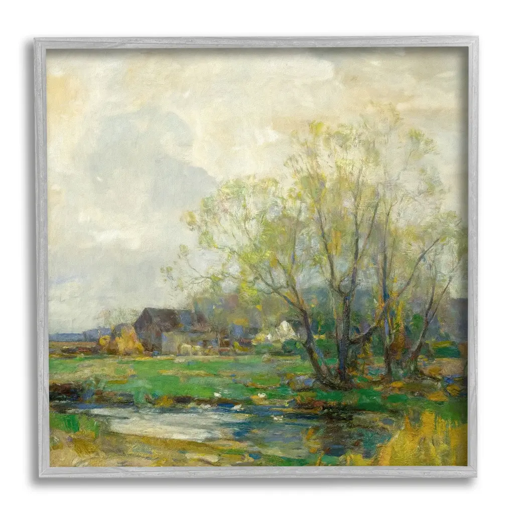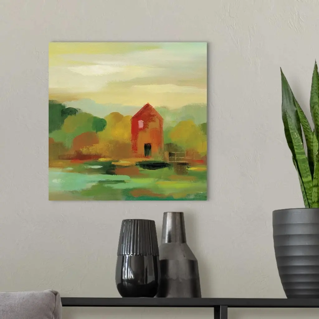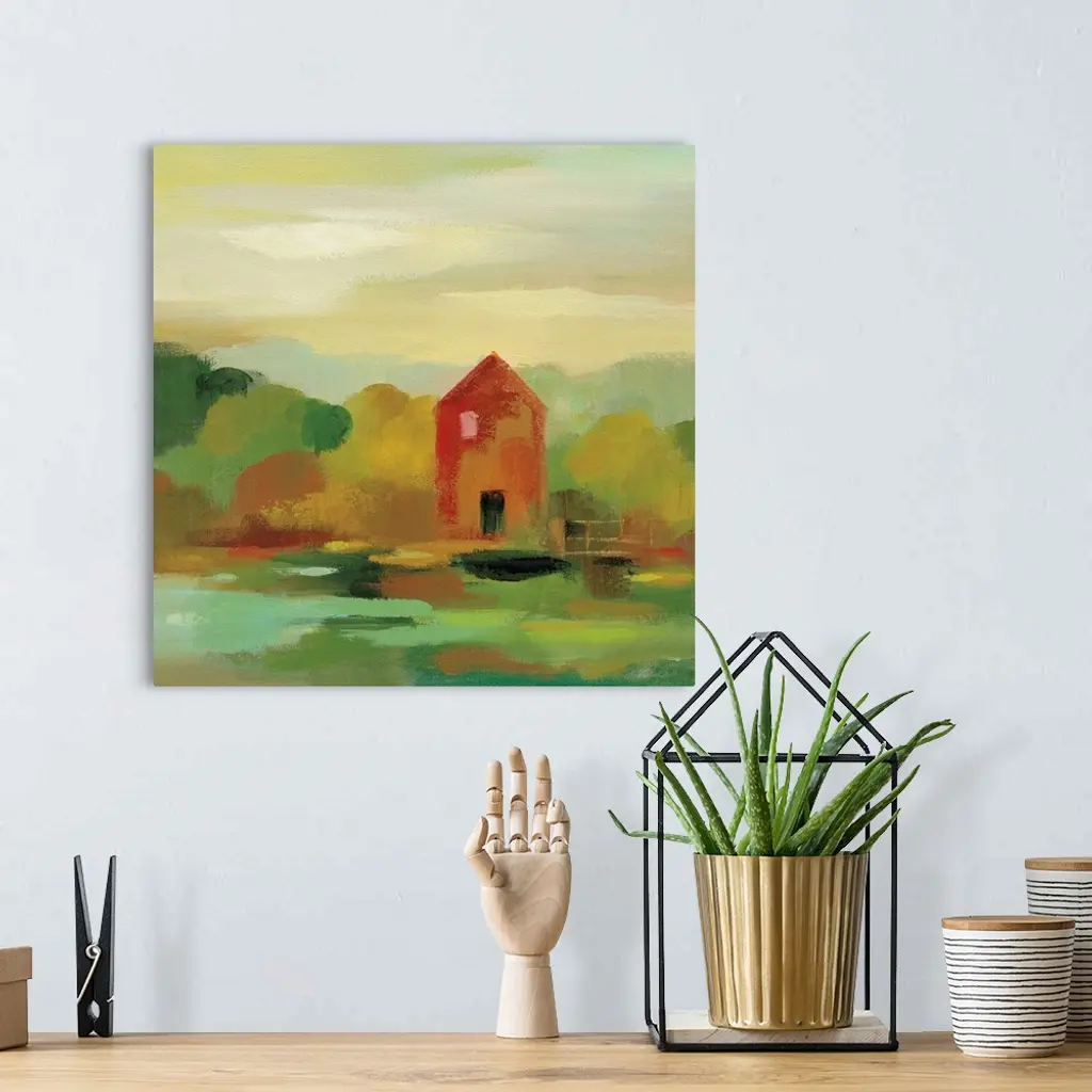 Contemporary landscape painting with a red barn house and Autumn colored trees.