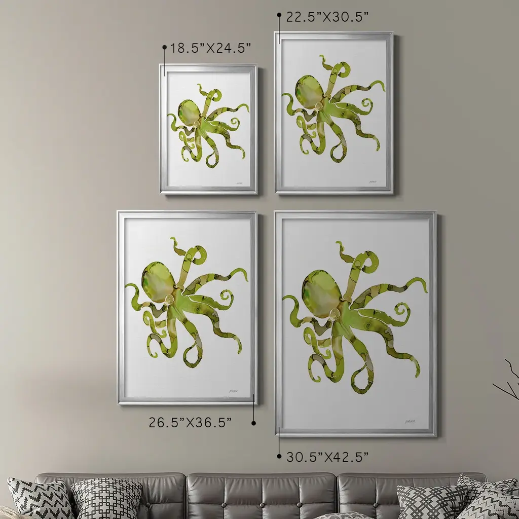 Octopus Premium Framed Print - Ready to Hang A Premium Framed Print created to last. Framed in distressed wood and available in an array of sizes and colors Featuring a beveled a solid wood stretcher bar, each piece comes ready to hand 4 SIZES AVAILABLE 30.5''X42.5'' - Overall Size 26.5'X36.5'' - Overall Size 22.5''x30.5'' - Overall Size 18.5''x24.5'' - Overall Size Each piece is made to order. Each piece comes with hanging hardware. Made in the USA Ready to Hang