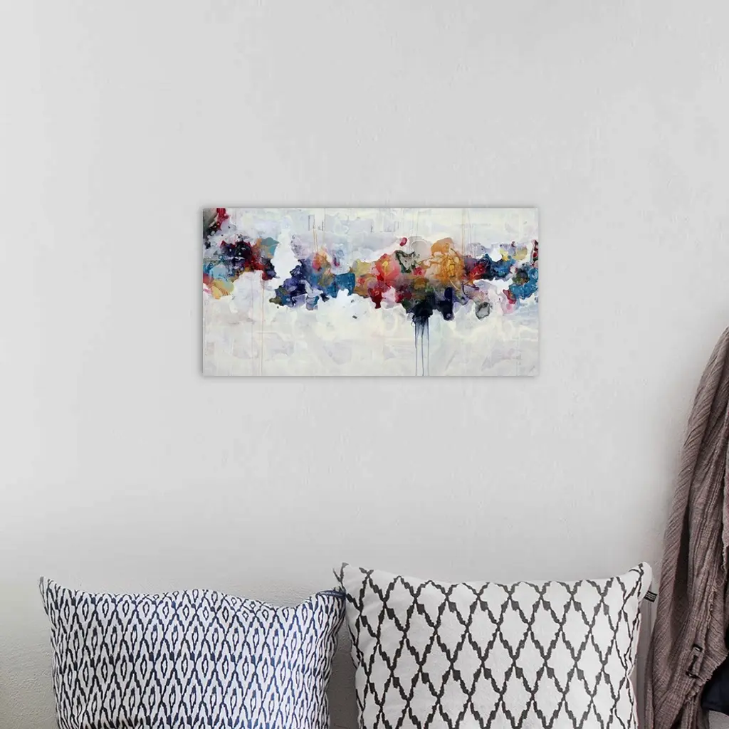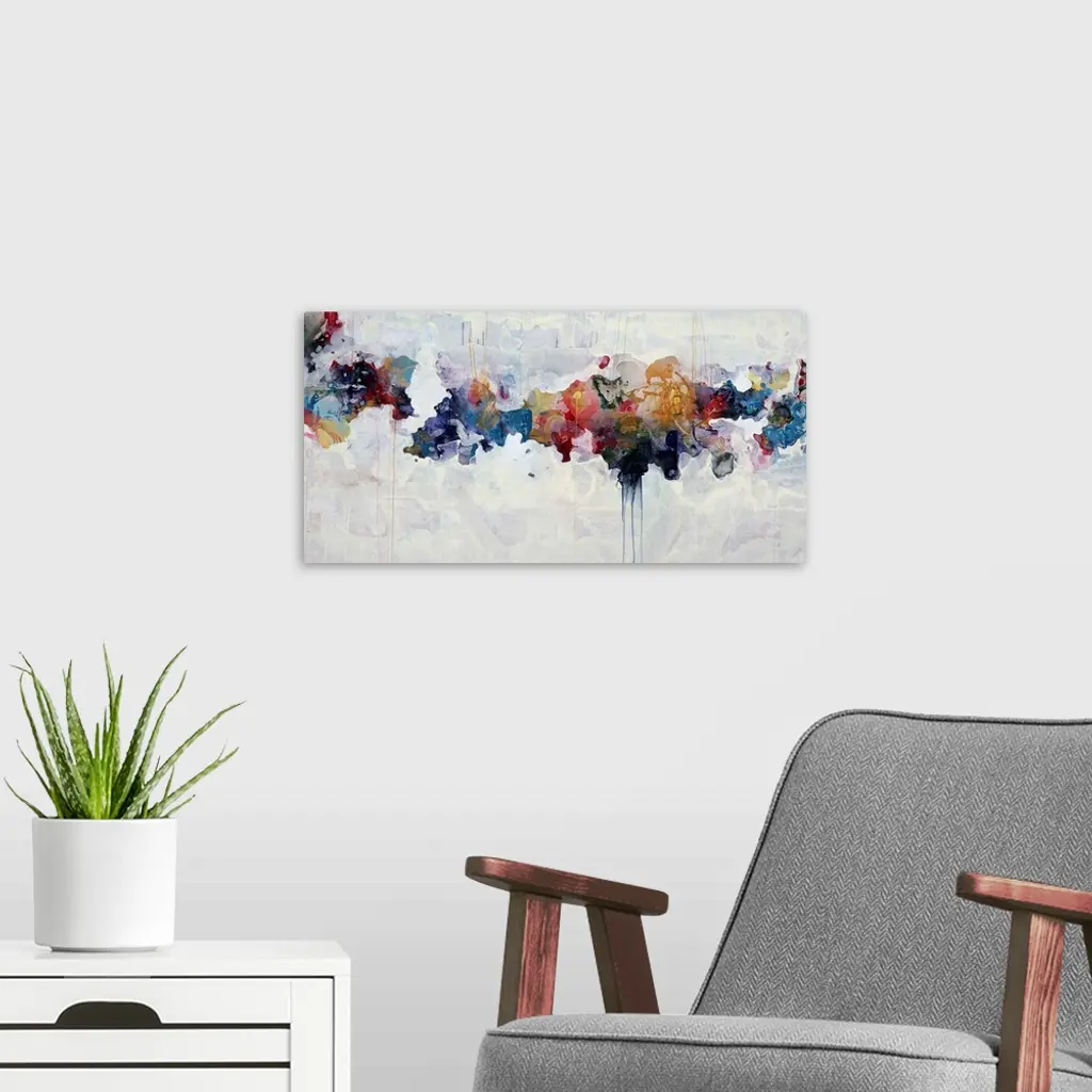 Abstract painting of a spectrum of dull colors arranged across the image with drips falling from some of the colors.