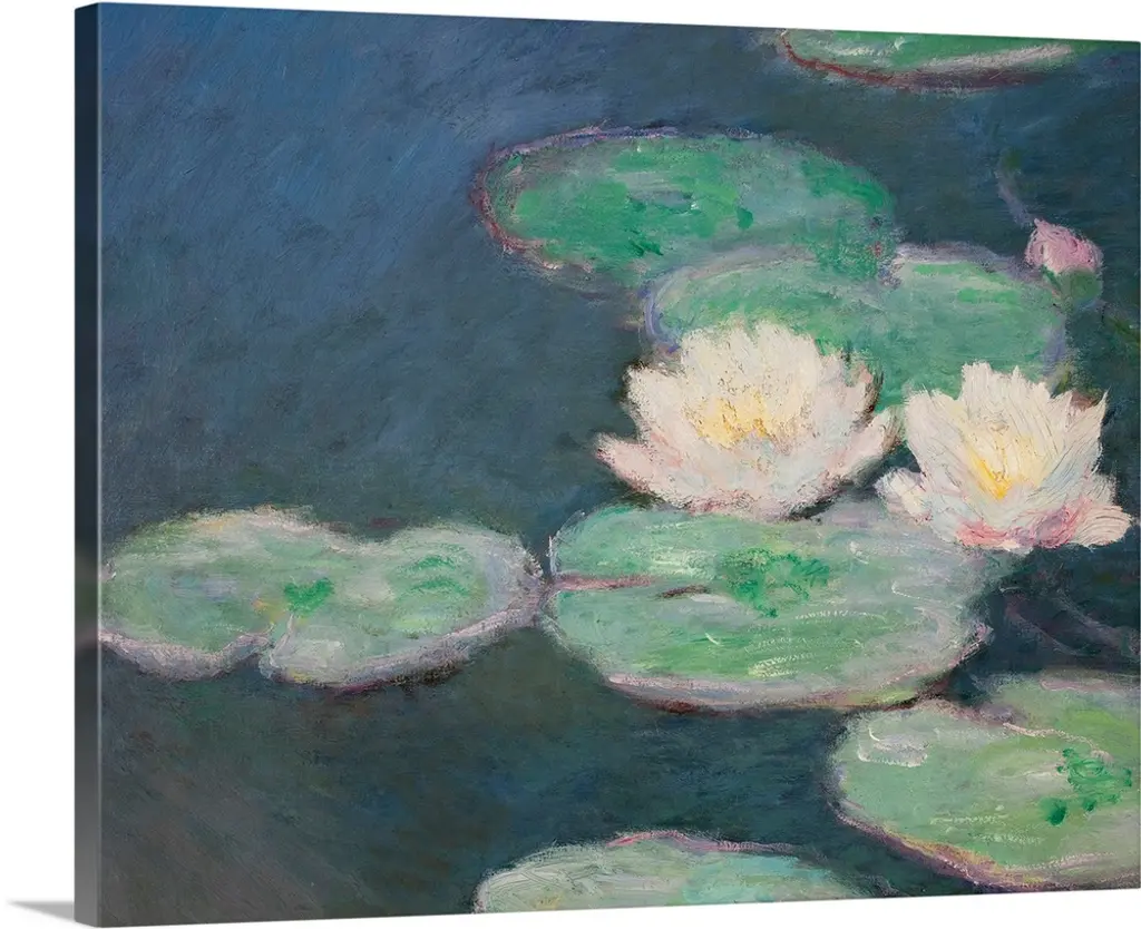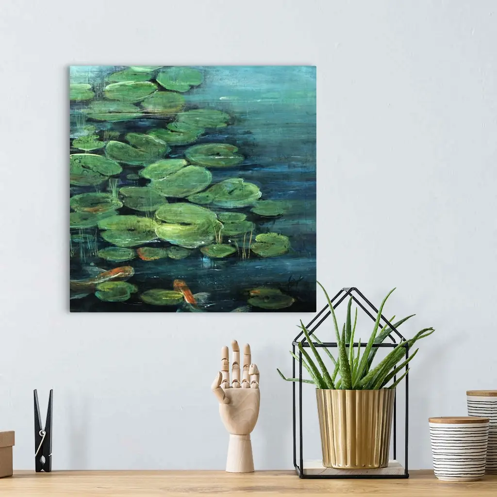 Contemporary artwork of a pond covered with lily pads and two orange koi fish swimming underneath.