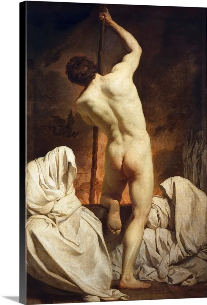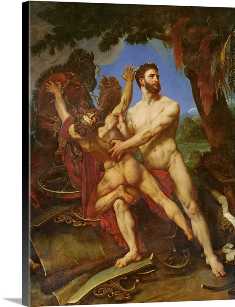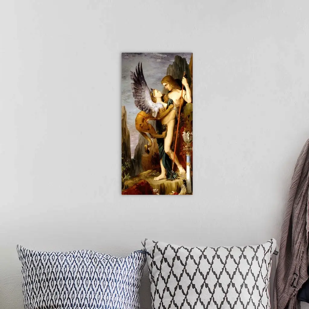 Moreau, at mid-career, made his mark with this painting at the Salon of 1864. It represents the Greek hero Oedipus confronting the Sphinx outside Thebes: he must solve her riddle to save his life and those of the besieged Thebans. Remains of victims who failed the test appear at bottom right. Moreau's mythological theme and archaizing style reflect his admiration for Ingres's 1808 version of the same subject and for the work of the early Renaissance painter Andrea Mantegna. In emulating these exemplars, Moreau diverged from the Realist sensibilities shaping French art in the 1860s.