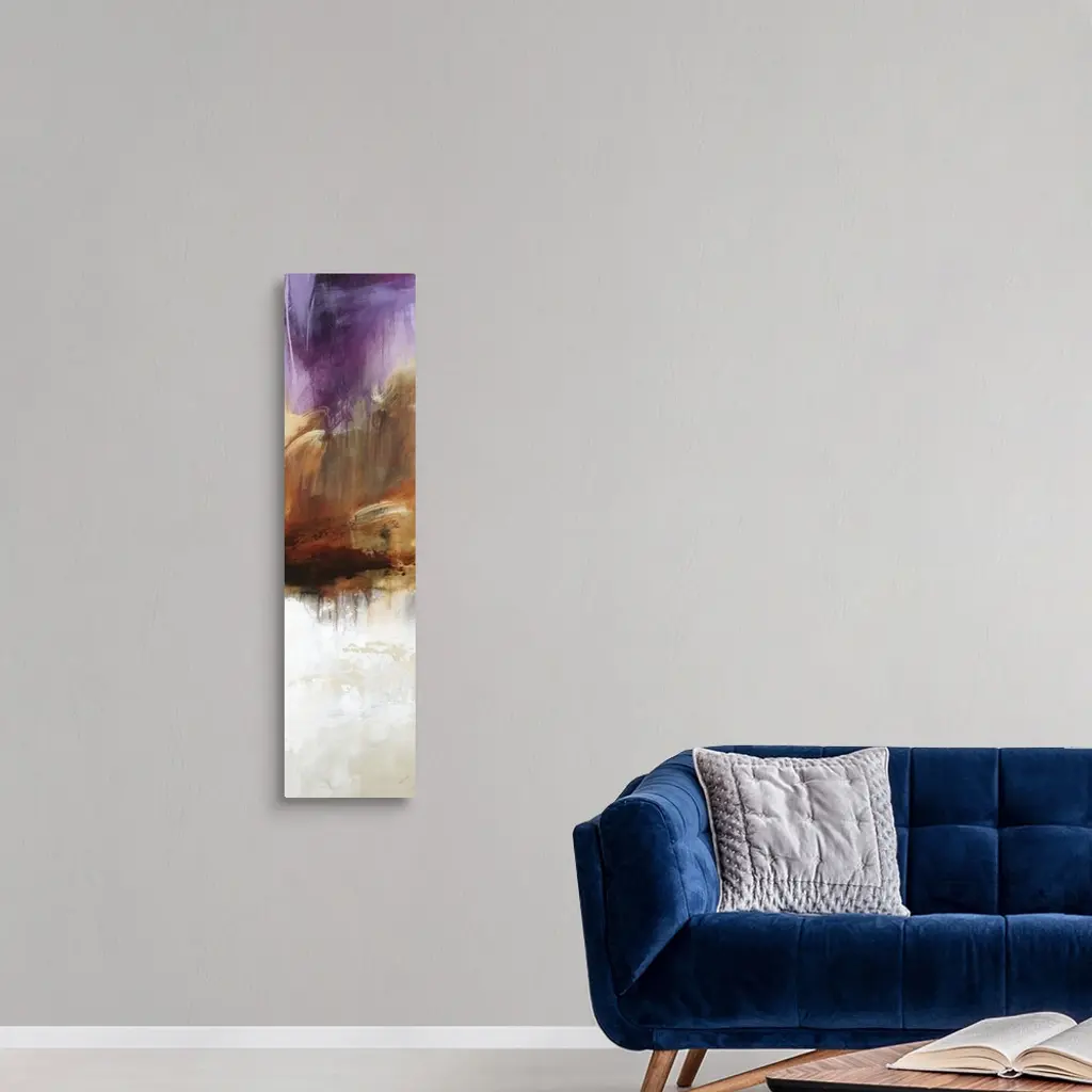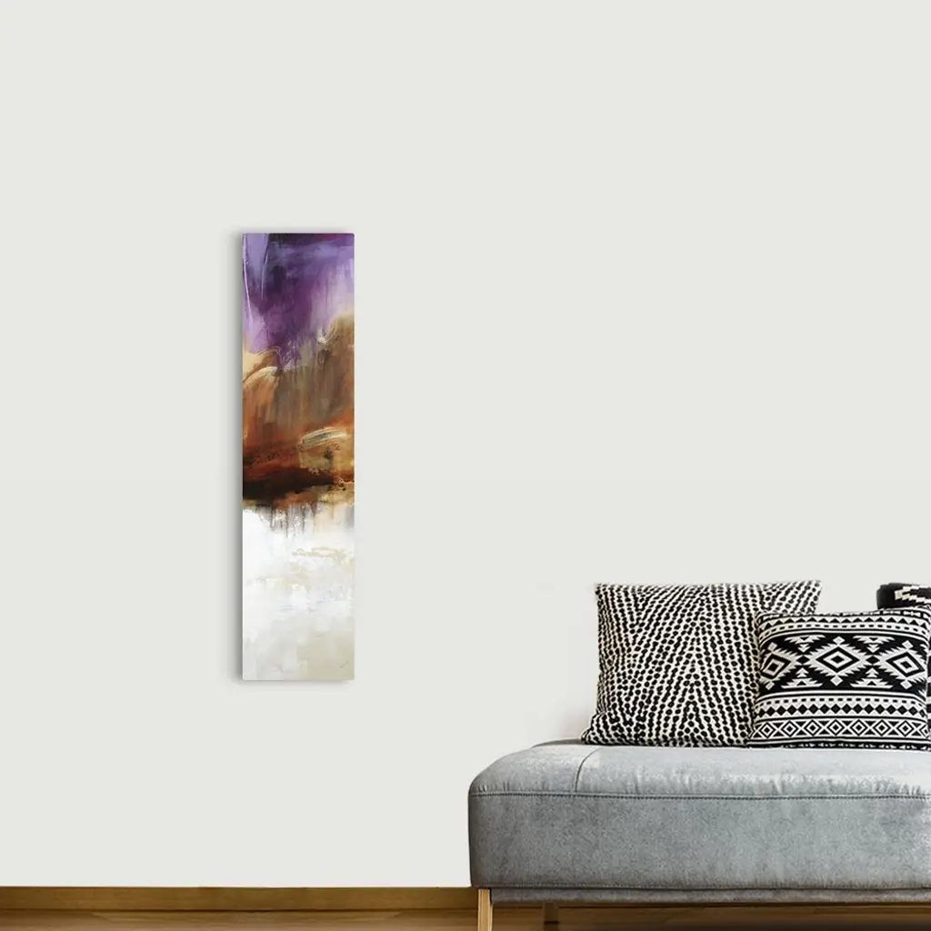 Large vertical abstract painting with bold strokes of paint in white, brown and purple.