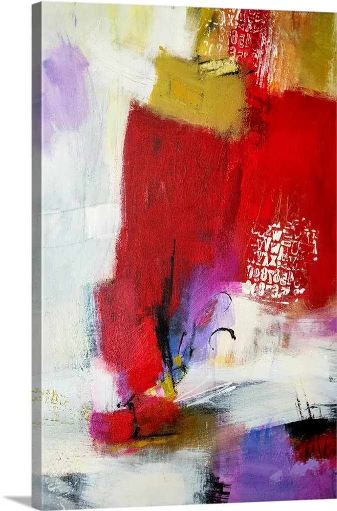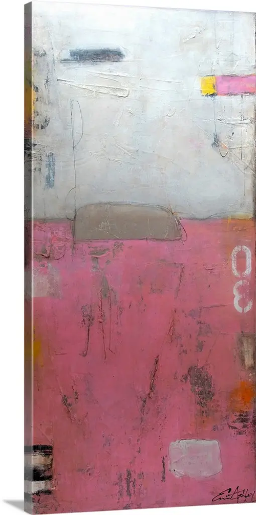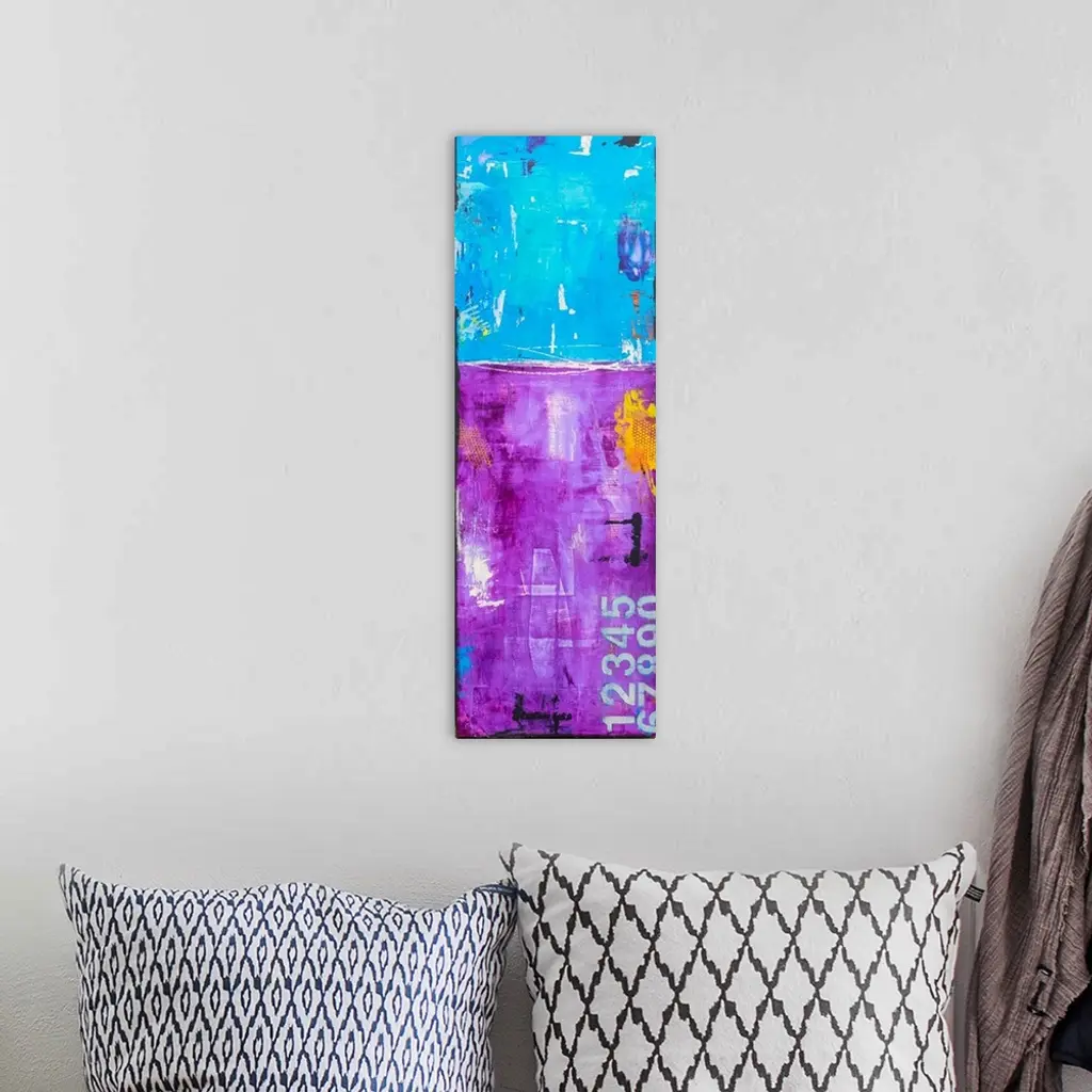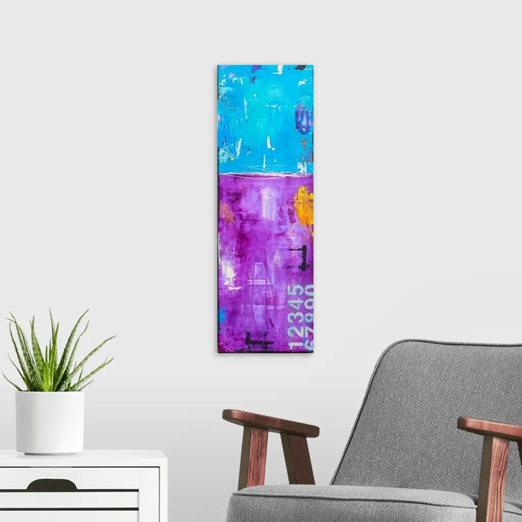 Vertical abstract artwork created with purple and teal with a portrait of a woman on the far left side and numbers on the bottom right.