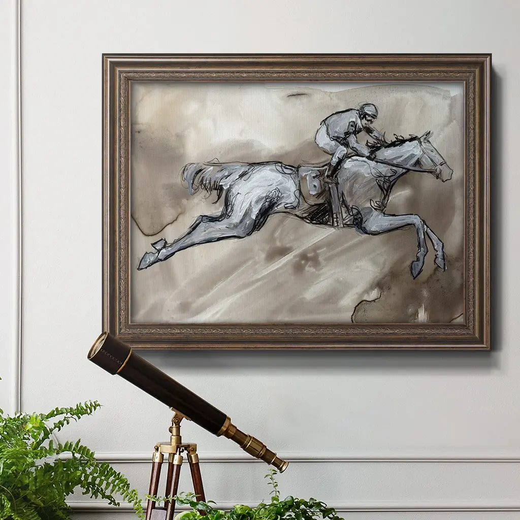 Off to the Races II Premium Framed Canvas- Ready to Hang A Premium Framed Canvas created to last. Framed in distressed wood and available in an array of sizes and colors Featuring a beveled a solid wood stretcher bar, each piece comes ready to hand 3 SIZES AVAILABLE 16''X20'' - Overall Size 18'X27'' - Overall Size 24''x36'' - Overall Size Each piece is made to order. Each piece comes with hanging hardware. Made in the USA Ready to Hang Giclee Paper Print Acrylic Glass Beveled Matt Board