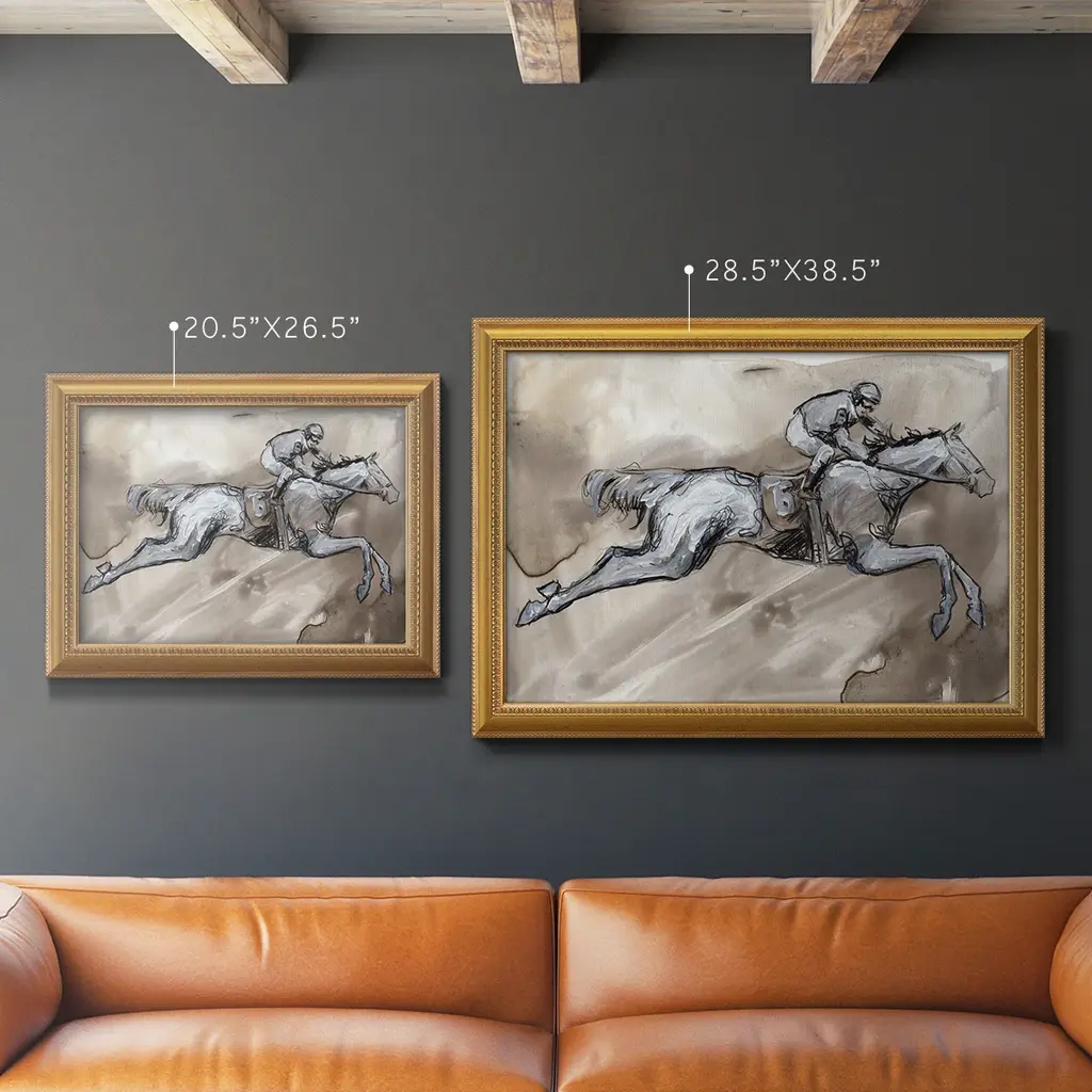 Off to the Races II Premium Framed Canvas- Ready to Hang A Premium Framed Canvas created to last. Framed in distressed wood and available in an array of sizes and colors Featuring a beveled a solid wood stretcher bar, each piece comes ready to hand 3 SIZES AVAILABLE 16''X20'' - Overall Size 18'X27'' - Overall Size 24''x36'' - Overall Size Each piece is made to order. Each piece comes with hanging hardware. Made in the USA Ready to Hang Giclee Paper Print Acrylic Glass Beveled Matt Board